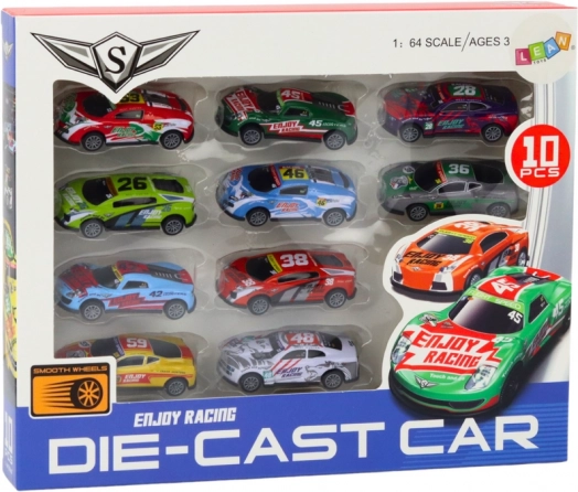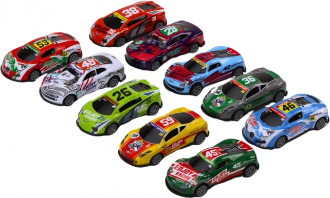 Šajā komplektā ir desmit mazas sacīkšu mašīnas, ideāli piemērotas radošai spēlei un izklaidei. Katrs modelis veidots sportiskā stilā un aprīkots ar brīvi ripojošiem riteņiem, kas spēlei piešķir vēl vairāk dinamikas. Lieliska rotaļlieta iztēles un radošuma attīstīšanai, ļaujot bērniem rīkot pašiem savas sacīkstes.