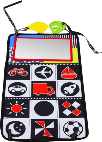 Spogulītis ļauj bērnam atklāt savu atspulgu, bet čaukstošā grāmatiņa nodrošina papildu maņu stimulāciju.
