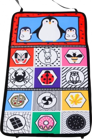 Paklājiņš ietver košus rakstus, kas veicina vizuālo stimulāciju un kontrasta uztveres attīstību.