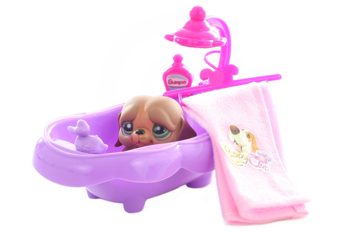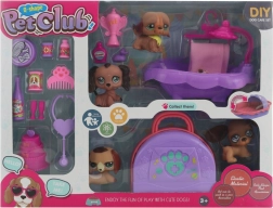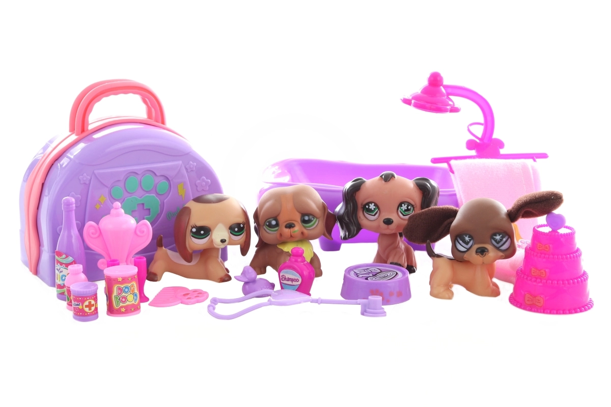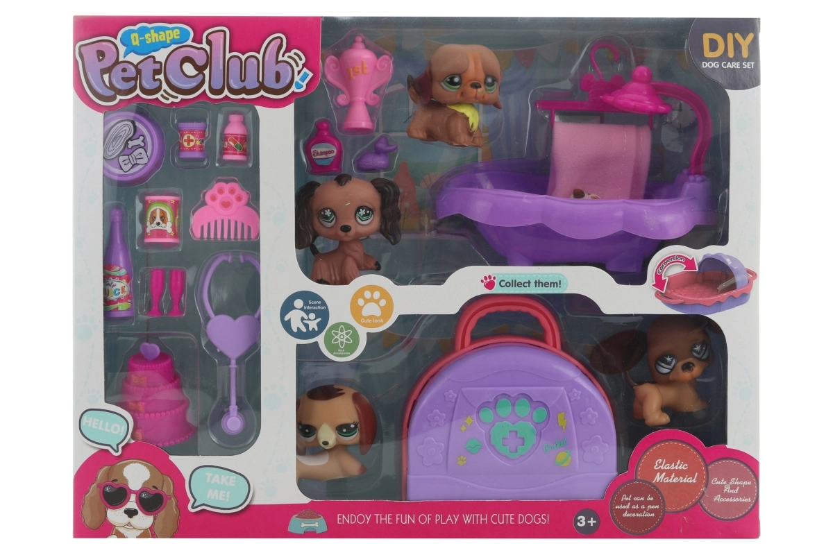 Šis košais suņu komplekts ar piederumiem pārvērtīs bērnistabu par mazu skaistumkopšanas un mājdzīvnieku salonu. Bērni var suņus peldināt vanniņā, nosusināt ar dvieli, pabarot un ielikt mīkstā guļvietā, kas paslēpta praktiskajā koferītī. Viss izgatavots no izturīgas plastmasas un pielāgots mazām bērnu rociņām.