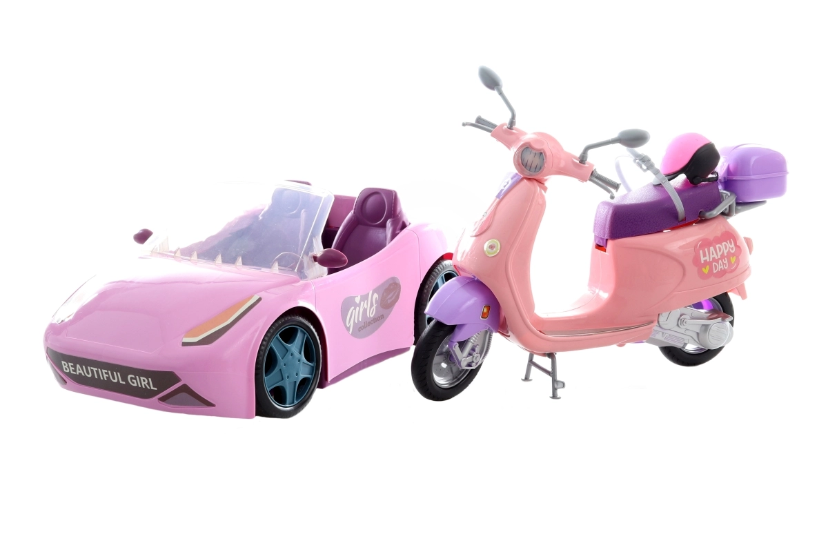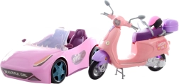 Rozā auto (33 cm), reālistisks motorolleris (30 cm) un velosipēds (17 cm) ļauj lellēm doties izbraucienos, uz pilsētu vai parku. Tie ir viegli vadāmi un veicina aktīvu spēli.