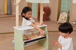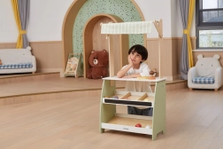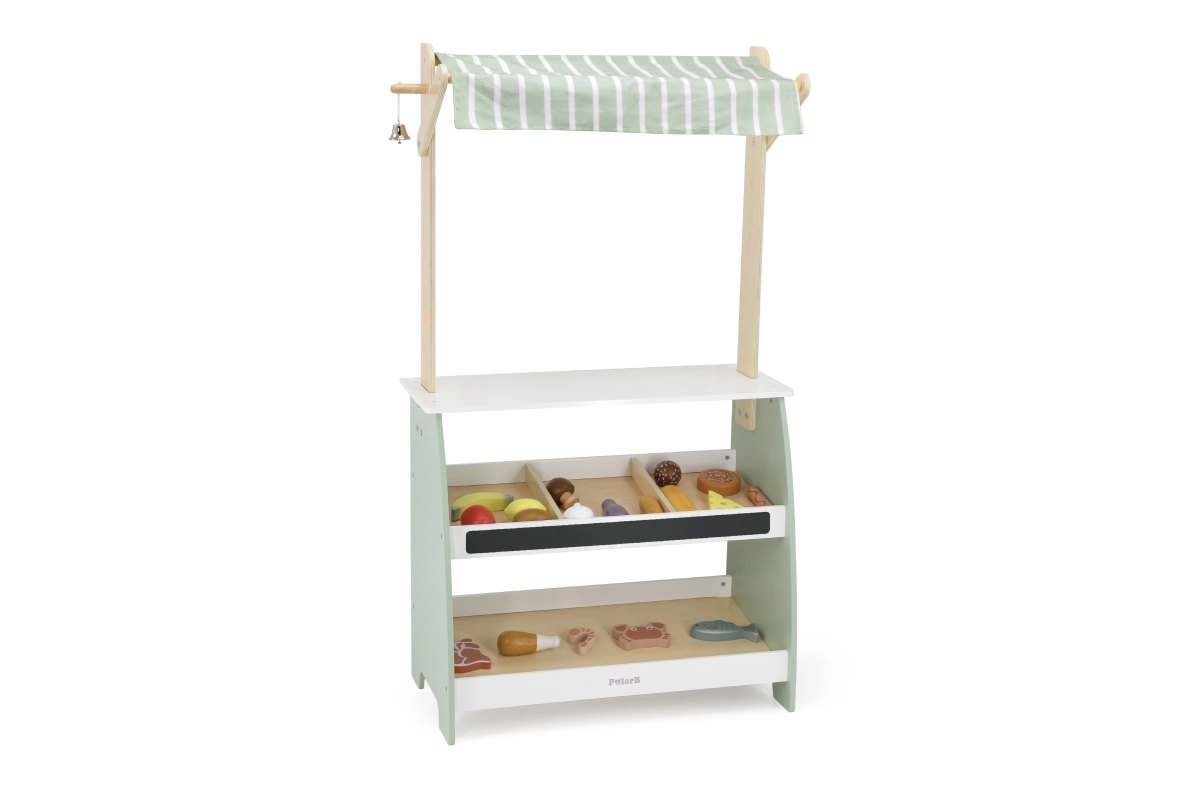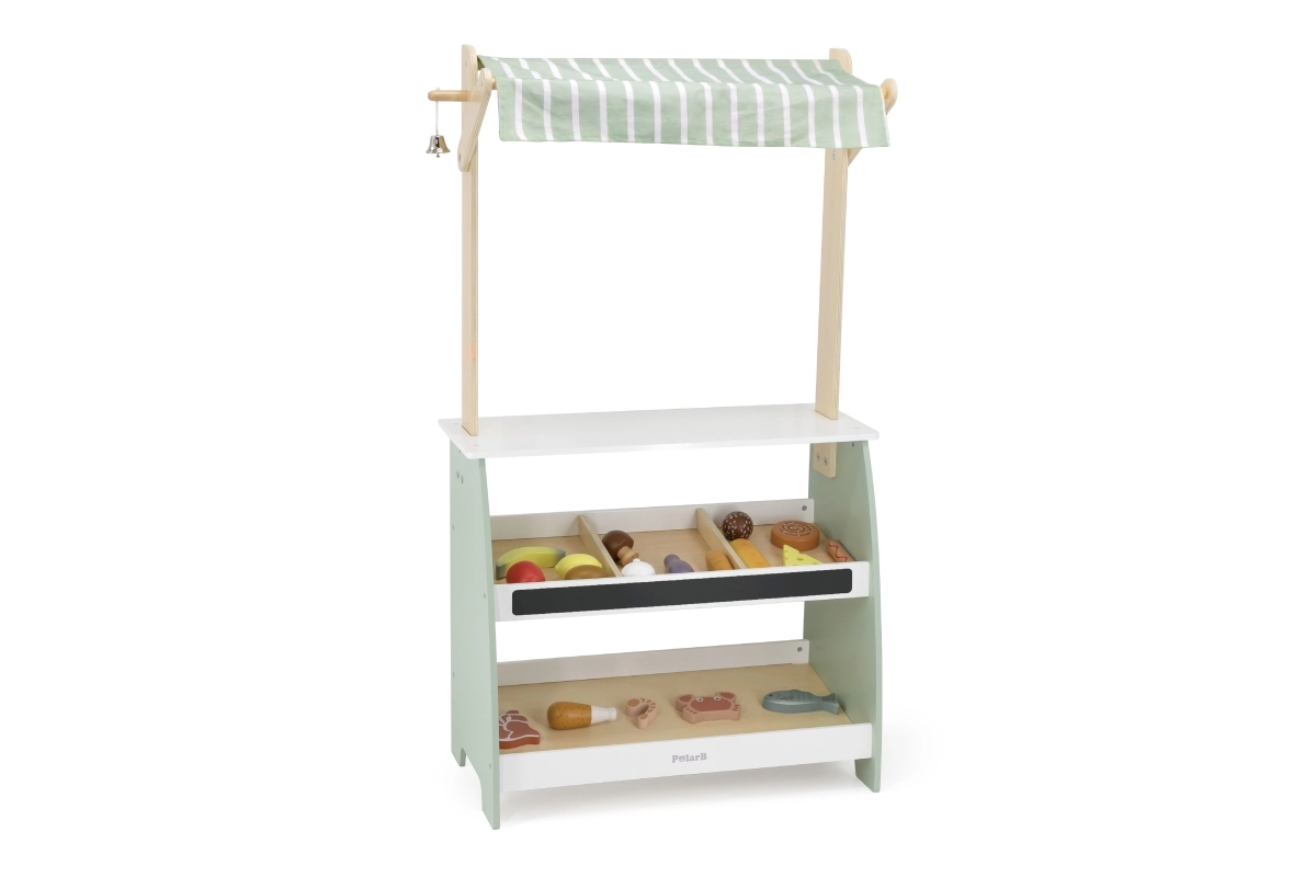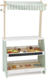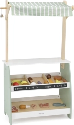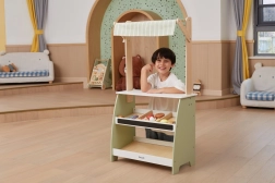 Koka rotaļu stends no zīmola Viga sniegs jūsu bērniem vēl augstāku izklaides līmeni, spēlējot veikalu. Izgatavots no izturīgas koksnes un krāsots maigos zaļos pasteļtoņos, šis stends apbur ne tikai ar izskatu, bet arī ar funkcionalitāti. Divas plauktu rindas, tekstila markīze un mazs zvaniņš padara to par ideālu stūrīti iztēles spēlēm.