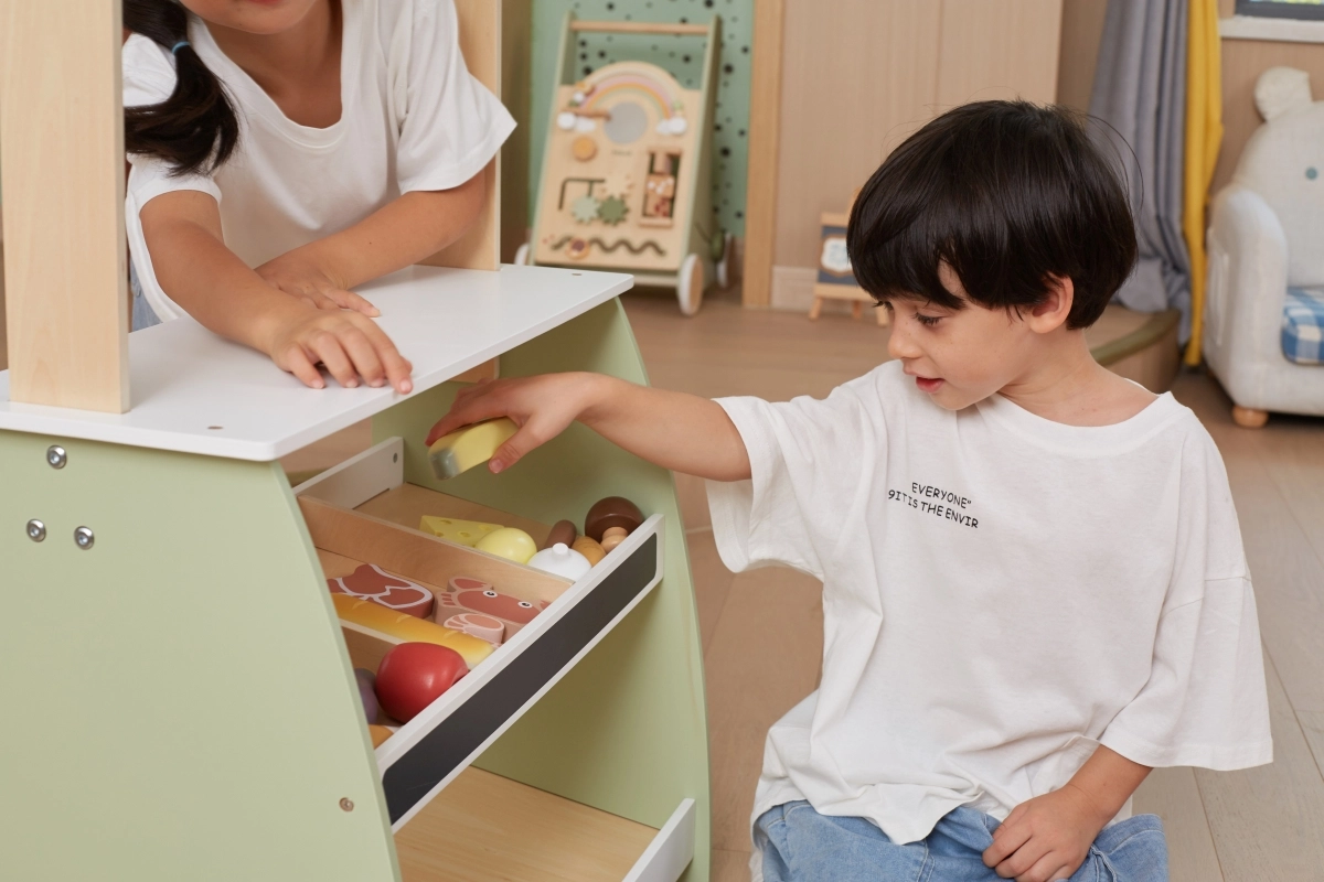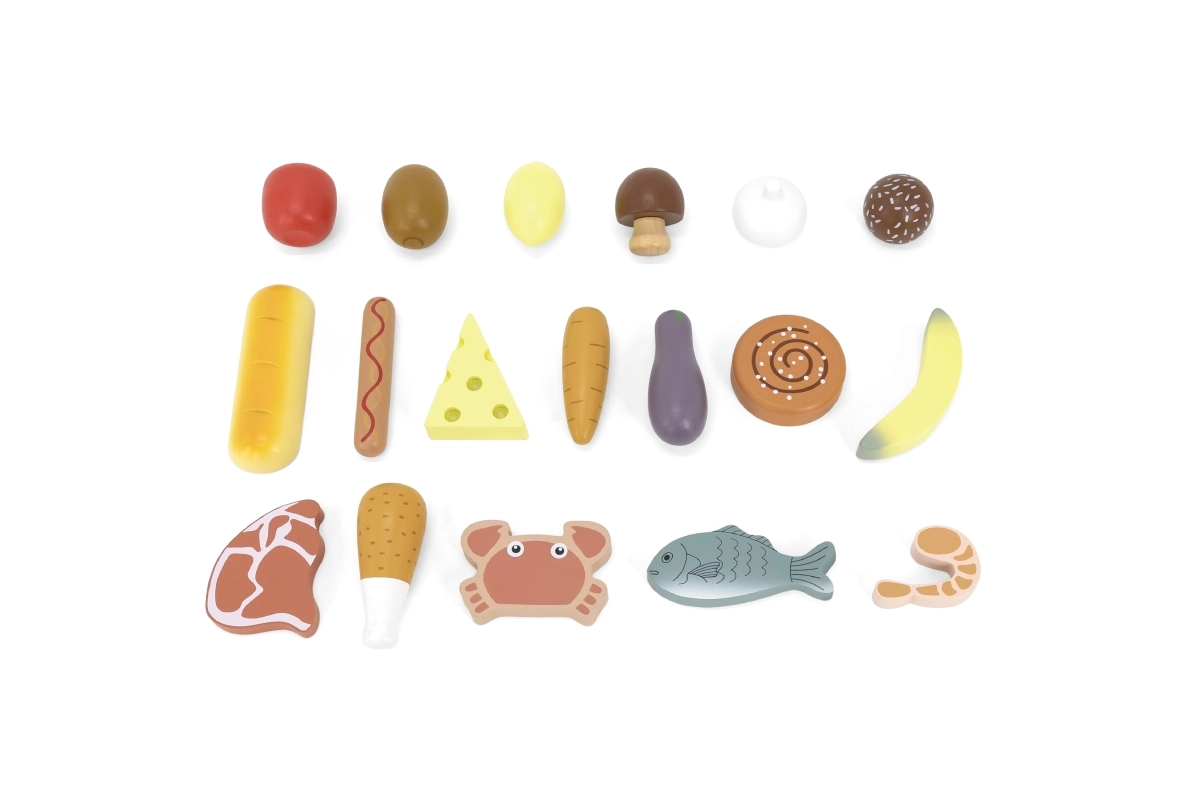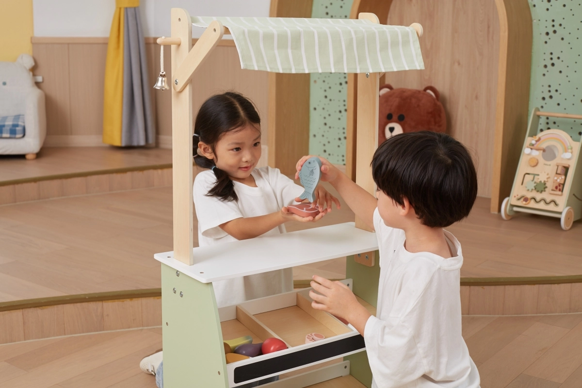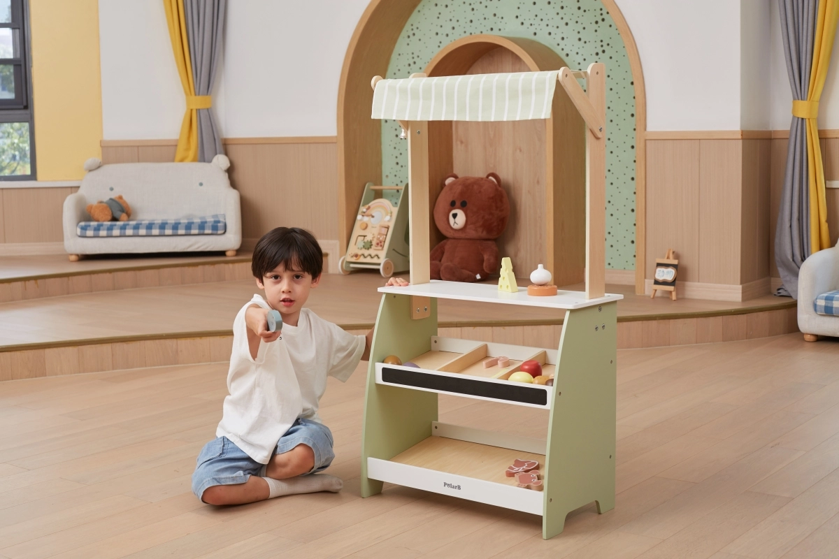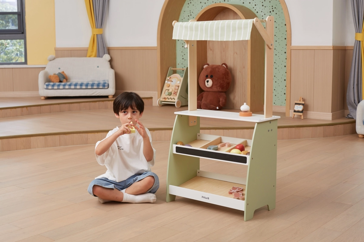 Koka stends piedāvā pietiekami daudz vietas dažādām rotaļlietām, tāpēc tas lieliski der spēlēm par veikalu vai dārzeņu tirgu.