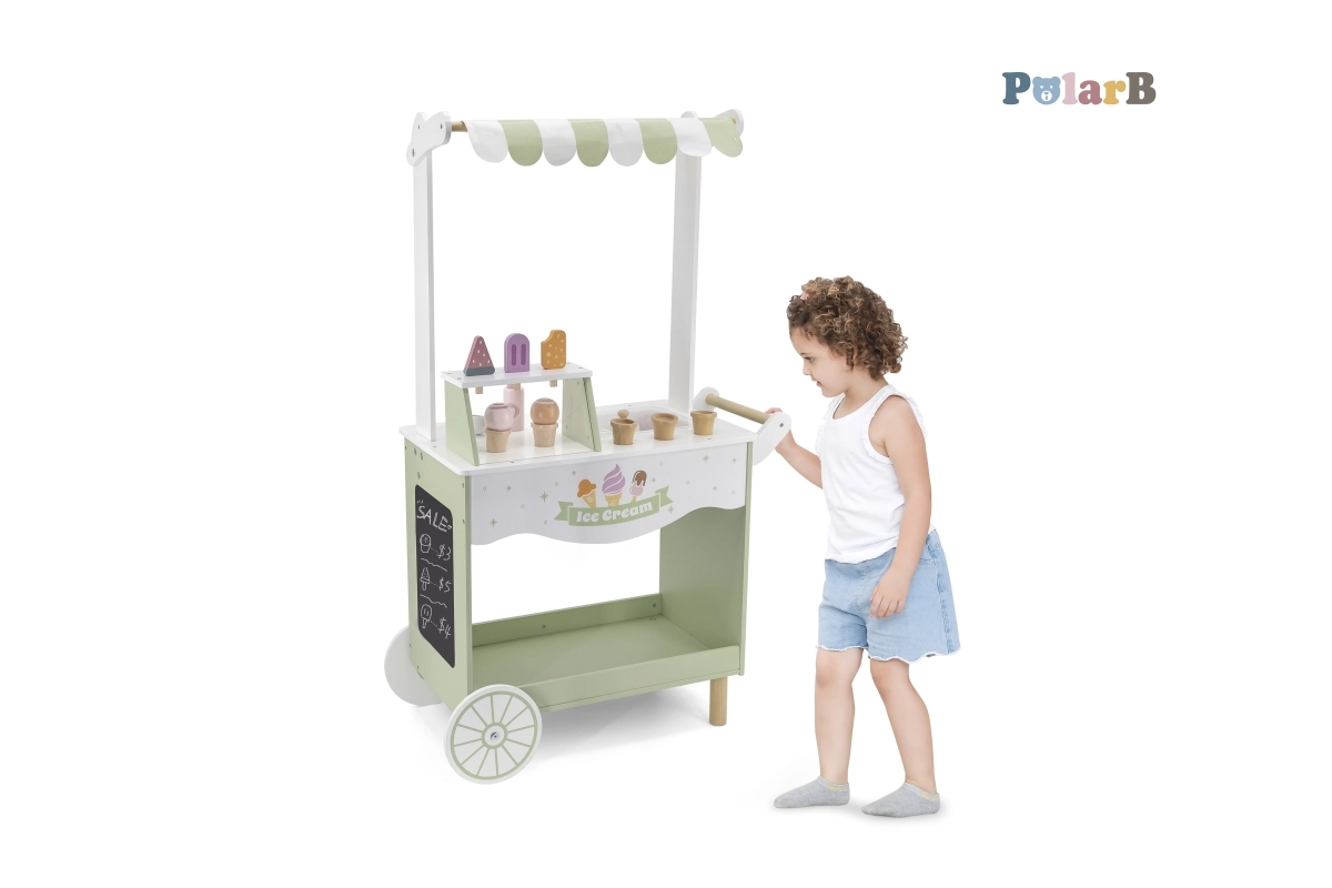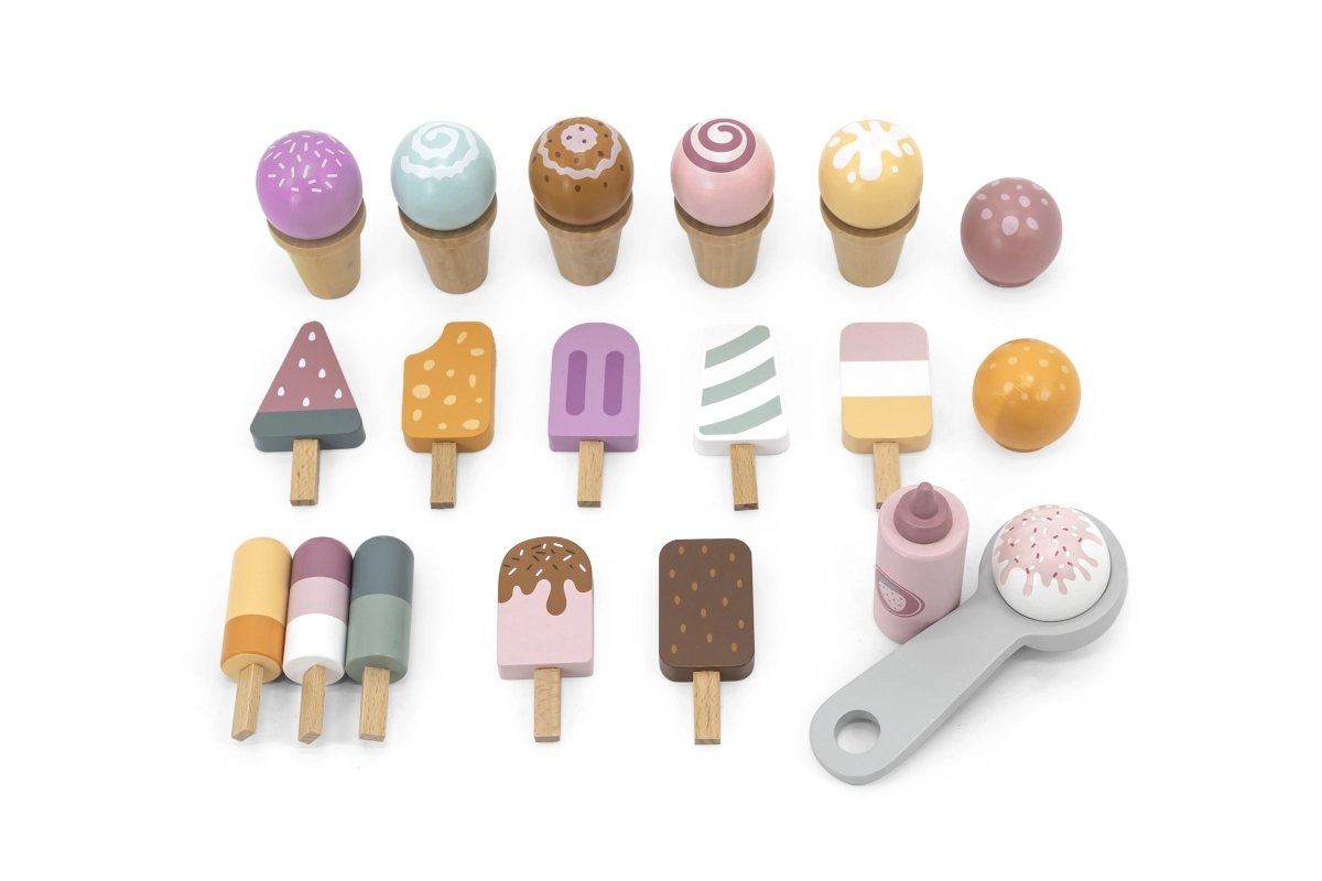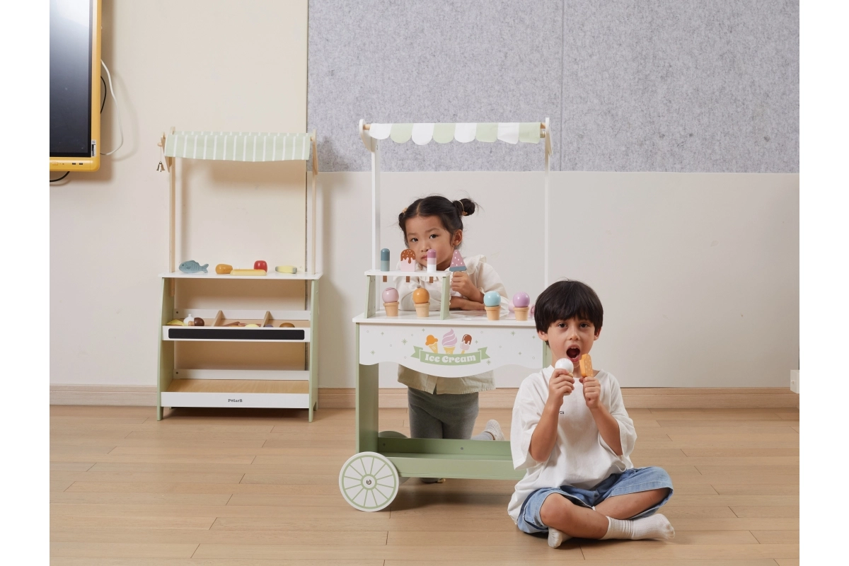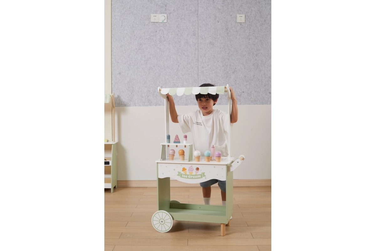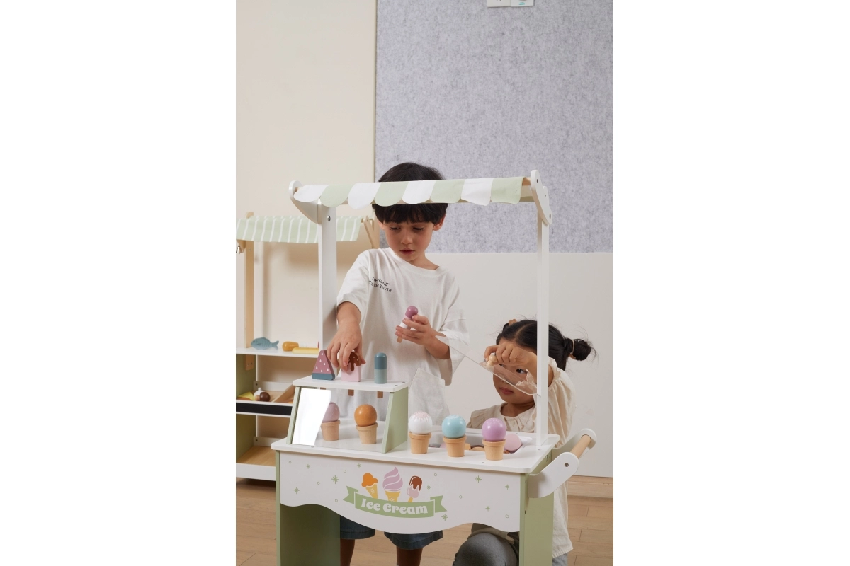 Dodies fantāzijas pilnā piedzīvojumā ar mūsu koka saldējumu kiosku bērniem. Šis košais kiosks ietver plašu koka saldējumu un piederumu klāstu, kas bērnus izklaidēs stundām ilgi: