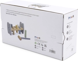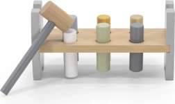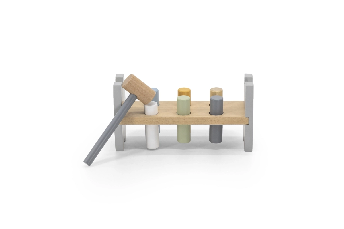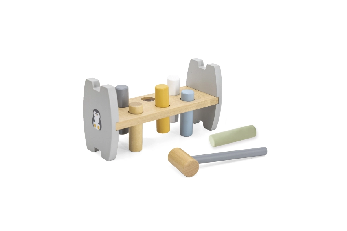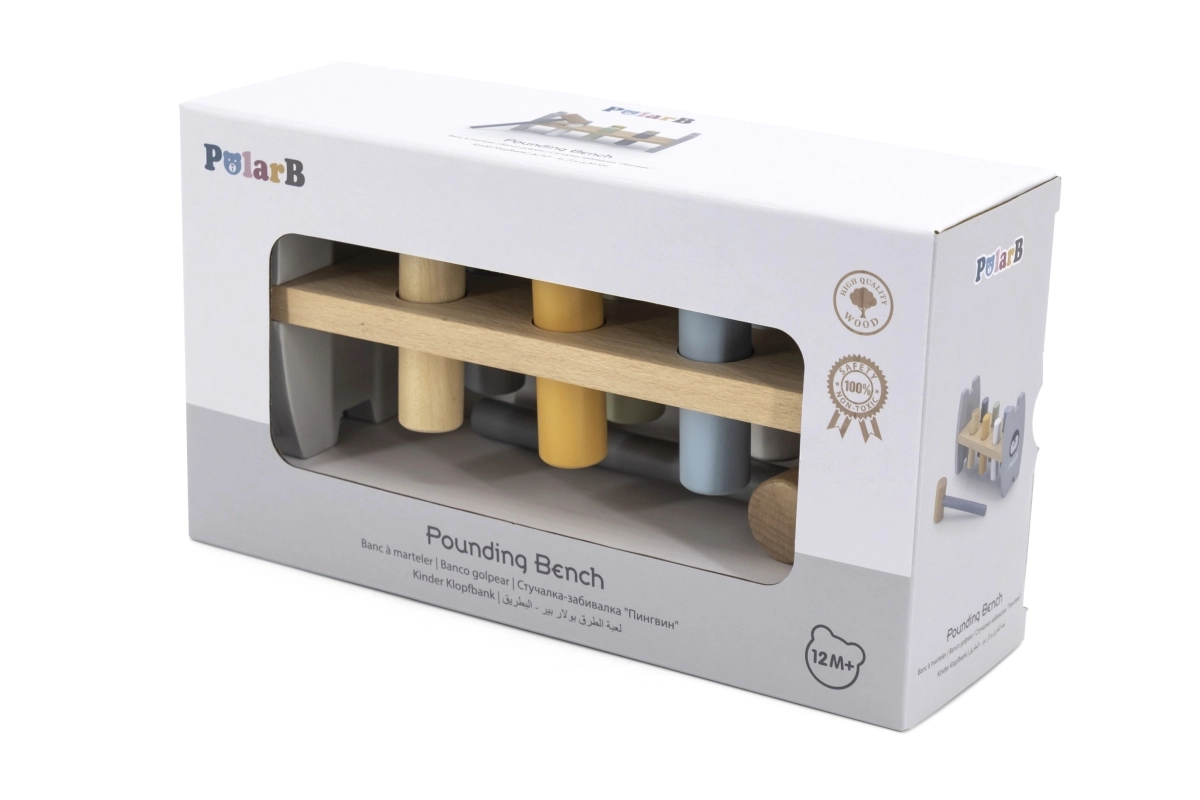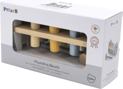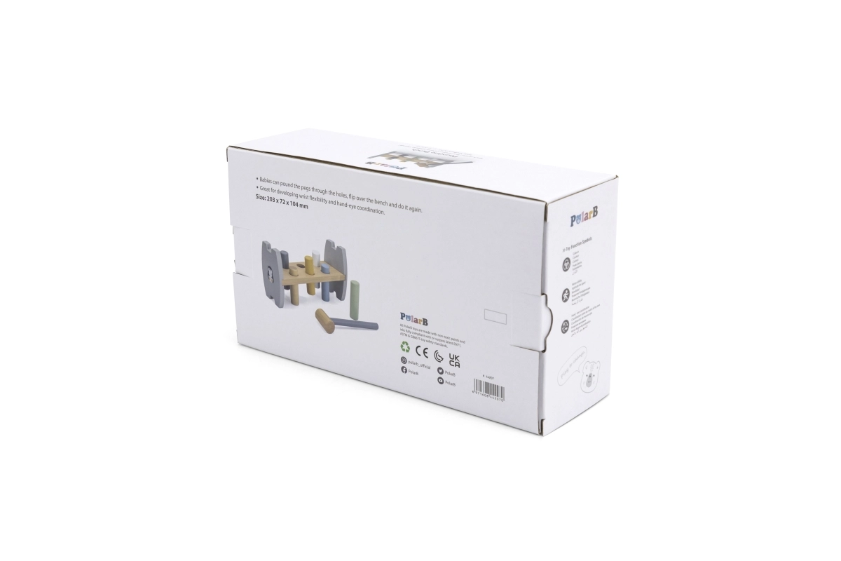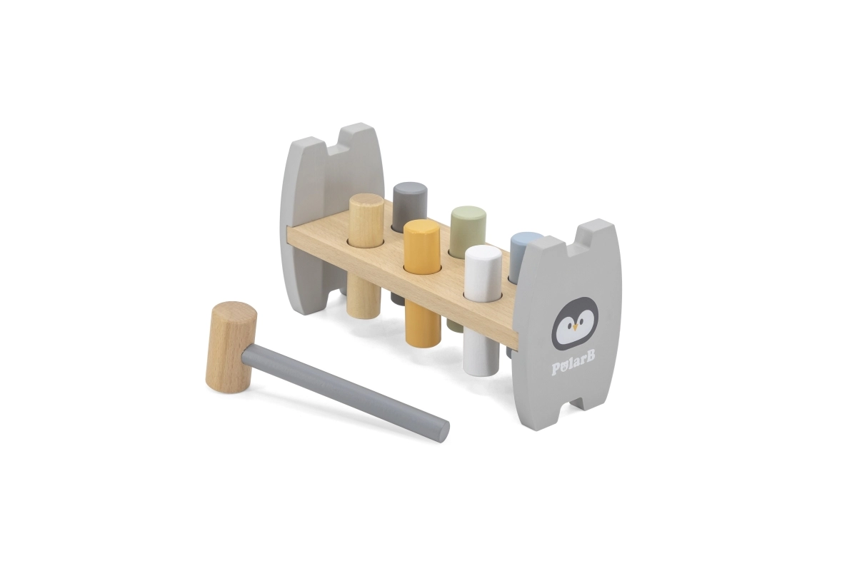 Viga PolarB koka rotaļlieta ar tapām un āmuriņu Montessori ir ideāli piemērota bērnu koordinācijas un sīko motorisko prasmju attīstīšanai. Bērni ir aicināti iedzīt visas tapas atverēs, pēc kā tās iziet cauri rāmja otrā pusē. Šo darbību var atkārtot, pagriežot rotaļlietu.