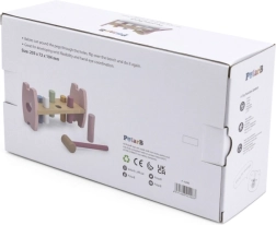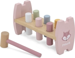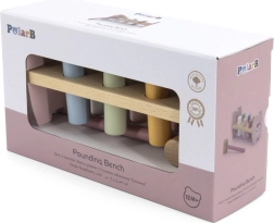 - Bērna uzdevums ir iesist visas tapas atverēs un pārbīdīt tās uz otras puses soliņam.