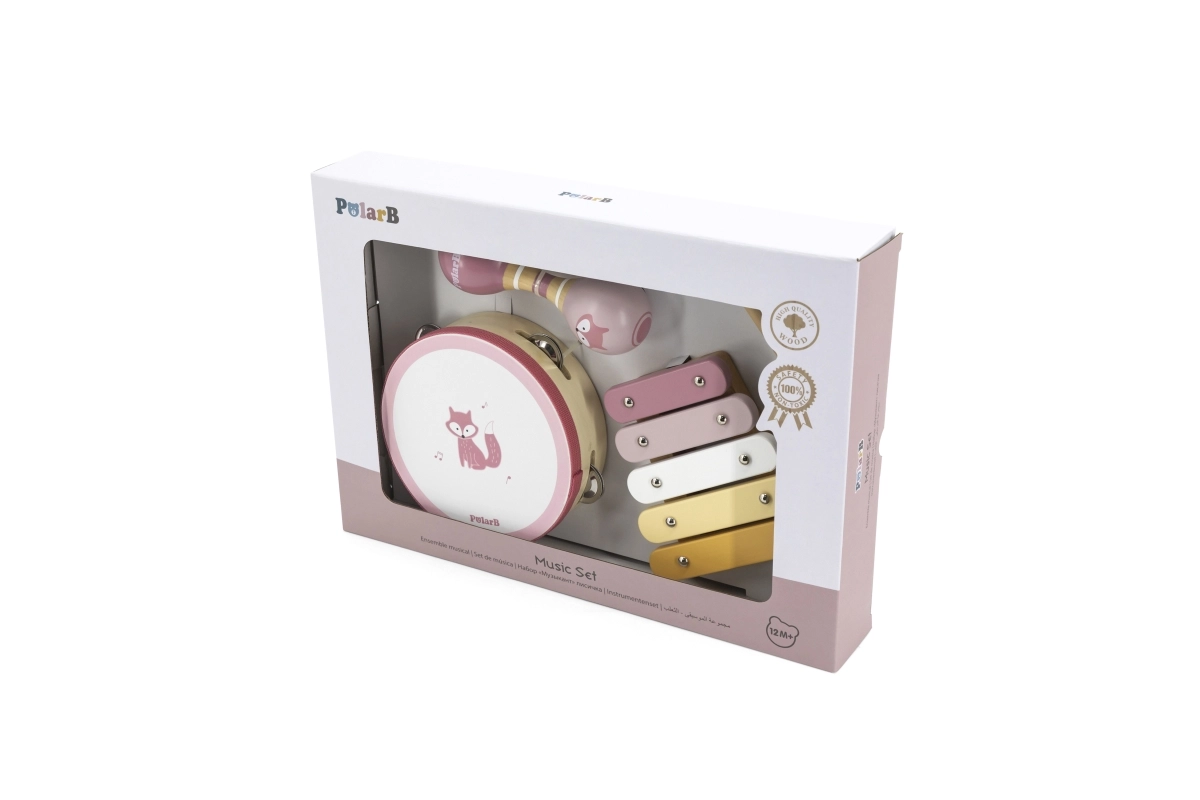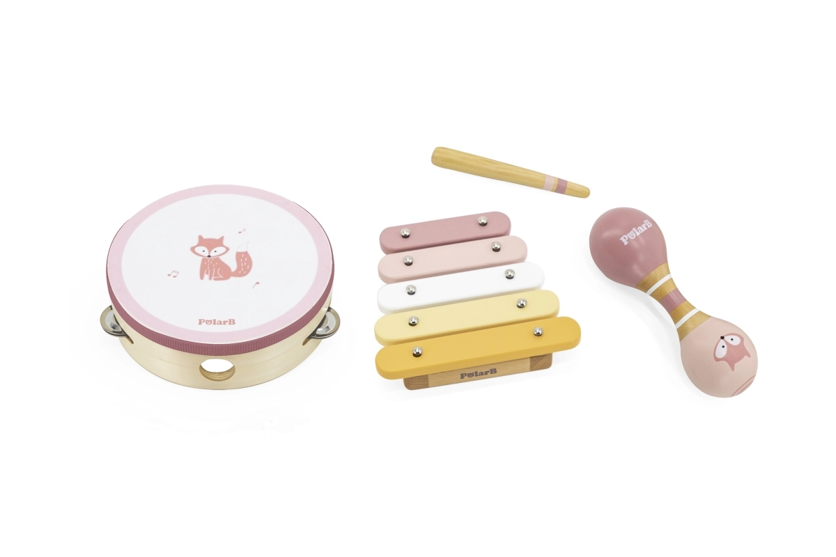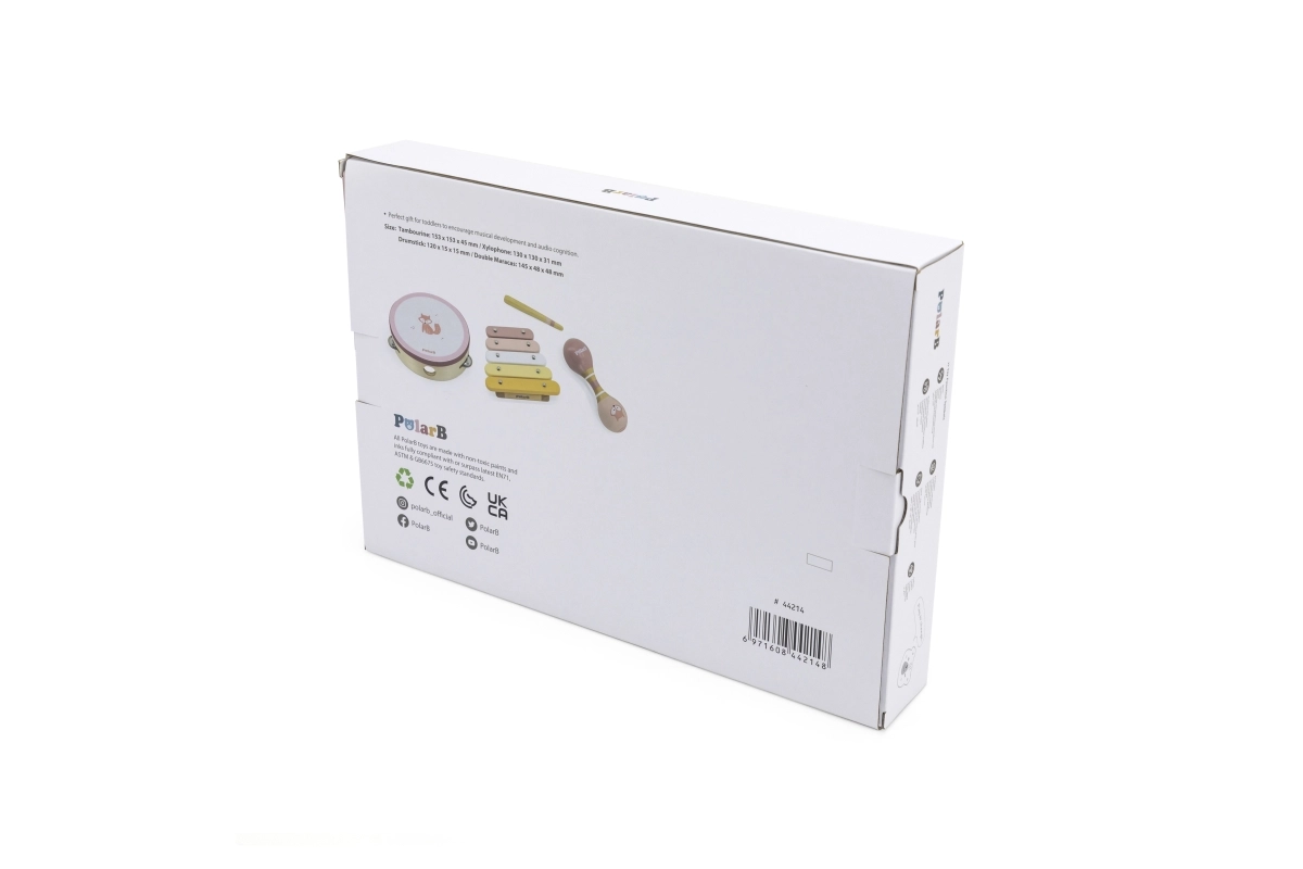 PolarB mūzikas komplekts no zīmola VIGA ir paredzēts bērniem no 12 mēnešiem un vecākiem. Tas ietver trīs mūzikas instrumentus: tamburīnu, ksilofonu un dubultos marakasus. Katrs instruments ir izgatavots no lakota koka un krāsots ar netoksiskām krāsām. Šis komplekts ir ideāls radošuma un muzikālo prasmju attīstībai.