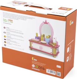 Skaists rozā tualetes galdiņš no Viga ir ideāls papildinājums jebkuram bērnu numuram. Komplektā ietilpst spogulis, izvelkama atvilktne un dažādi koka piederumi, lai radītu burvīgu fantāzijas pasauli. Izgatavots no kvalitatīvas koksnes un krāsots ar netoksiskām, bērniem drošām krāsām.