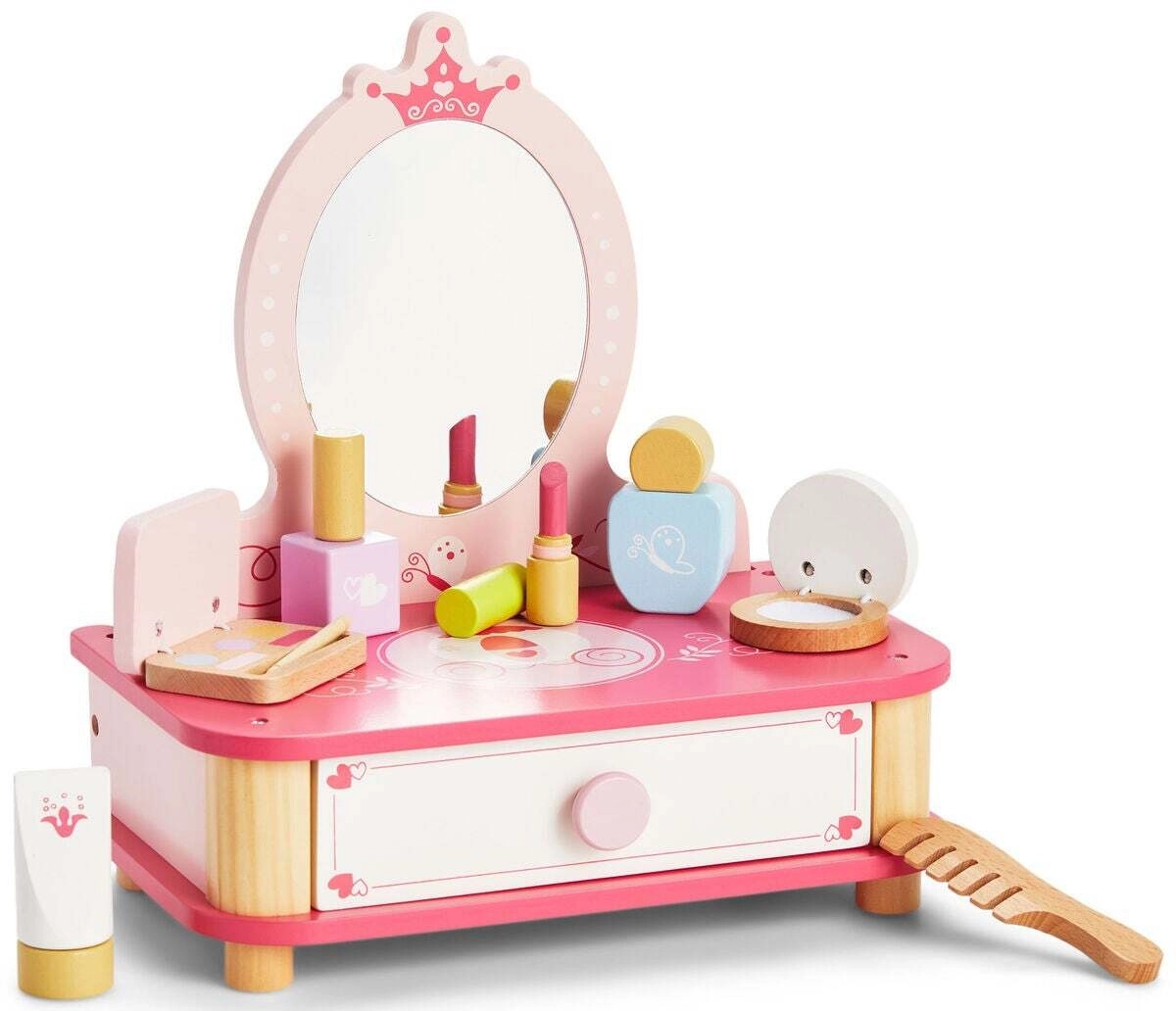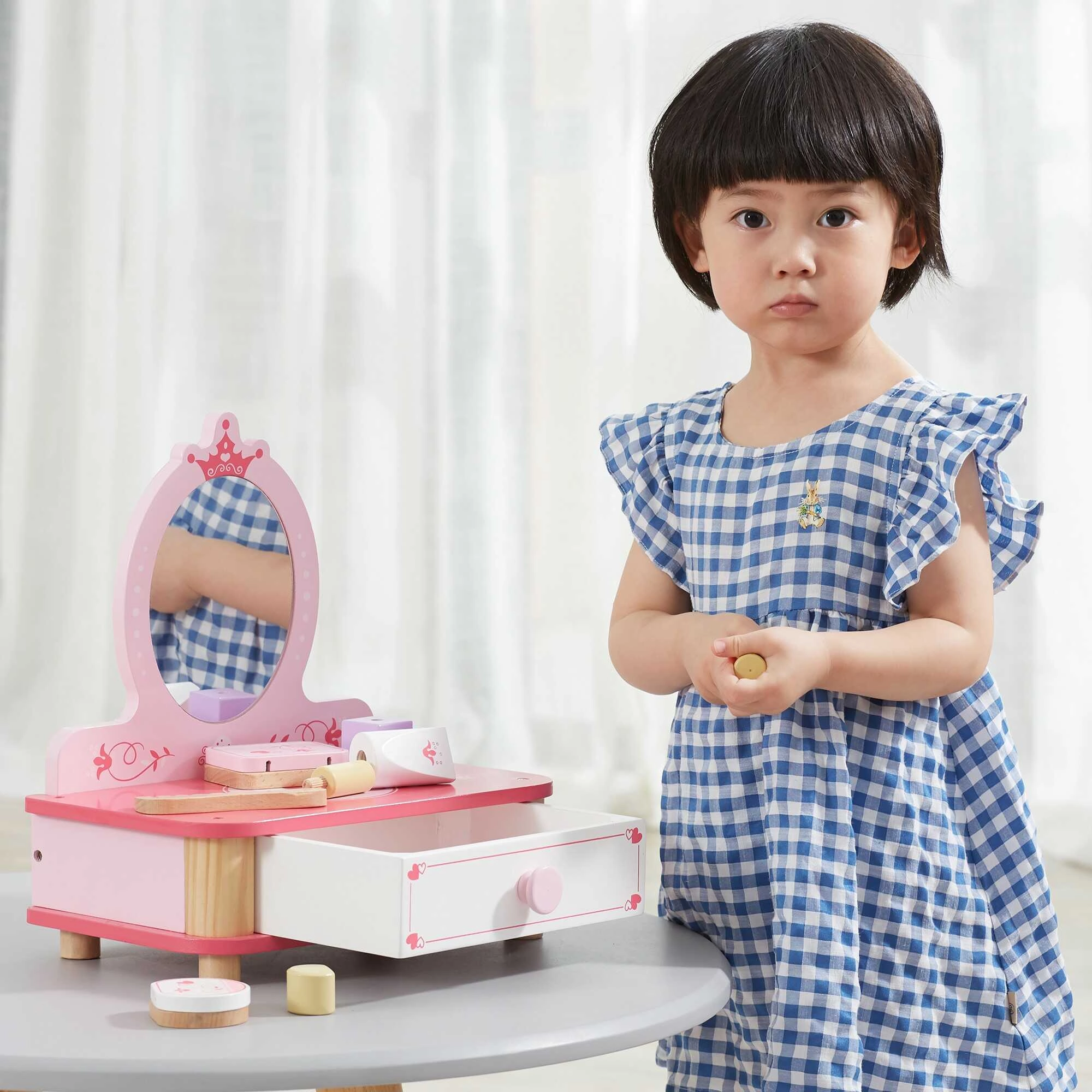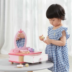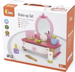 Komplektā ir koka piederumi, piemēram, lūpu krāsas, smaržas un acu ēnas, lai veidotu bezgalīgus rotaļu scenārijus.