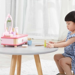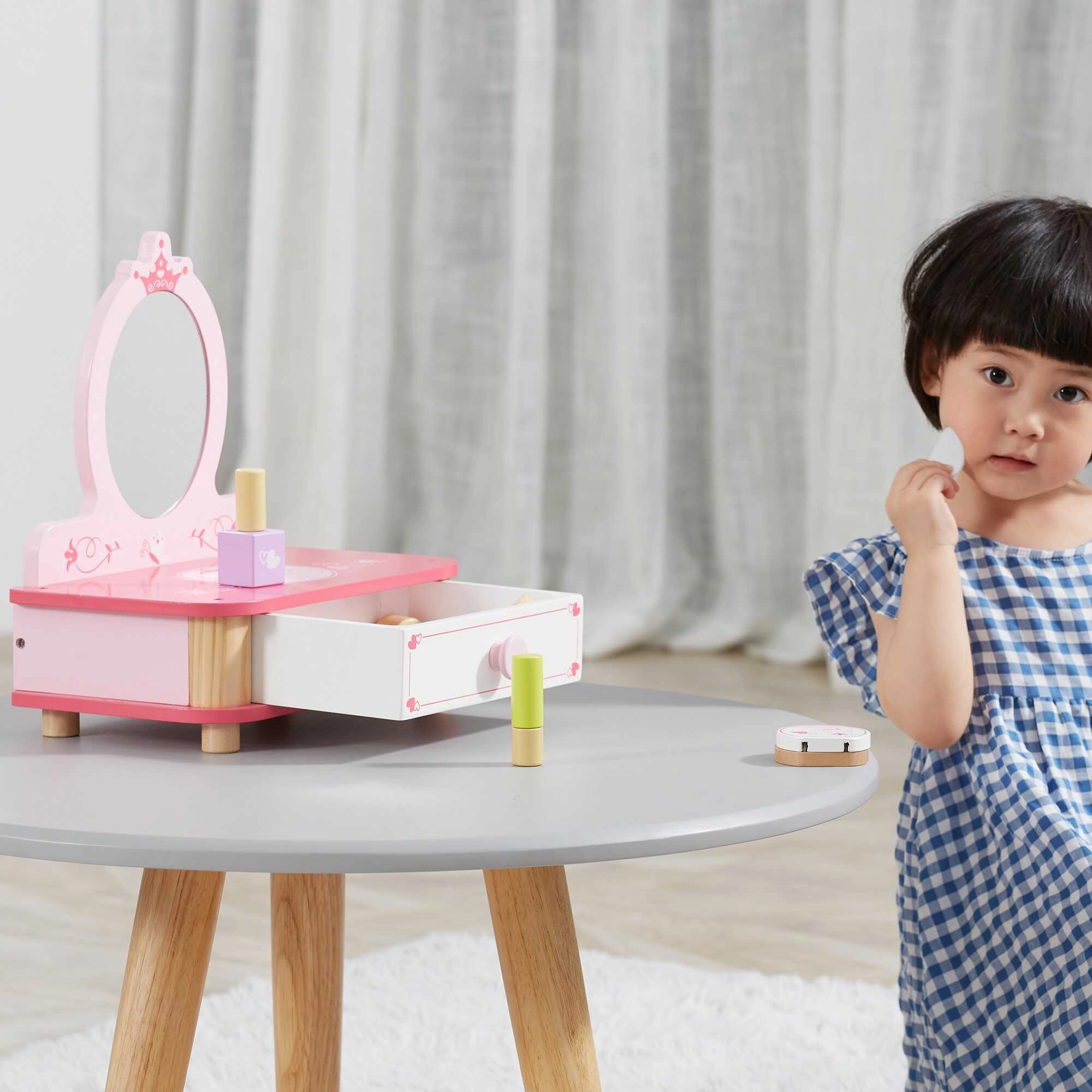 Viga koka tualetes galdiņš piedāvā spoguli un ietilpīgu atvilktni, kur mazās princeses var glabāt savus dārgumus. Rozā krāsa piešķir izstrādājumam elegantu izskatu un lieliski iederas bērnu istabā.
