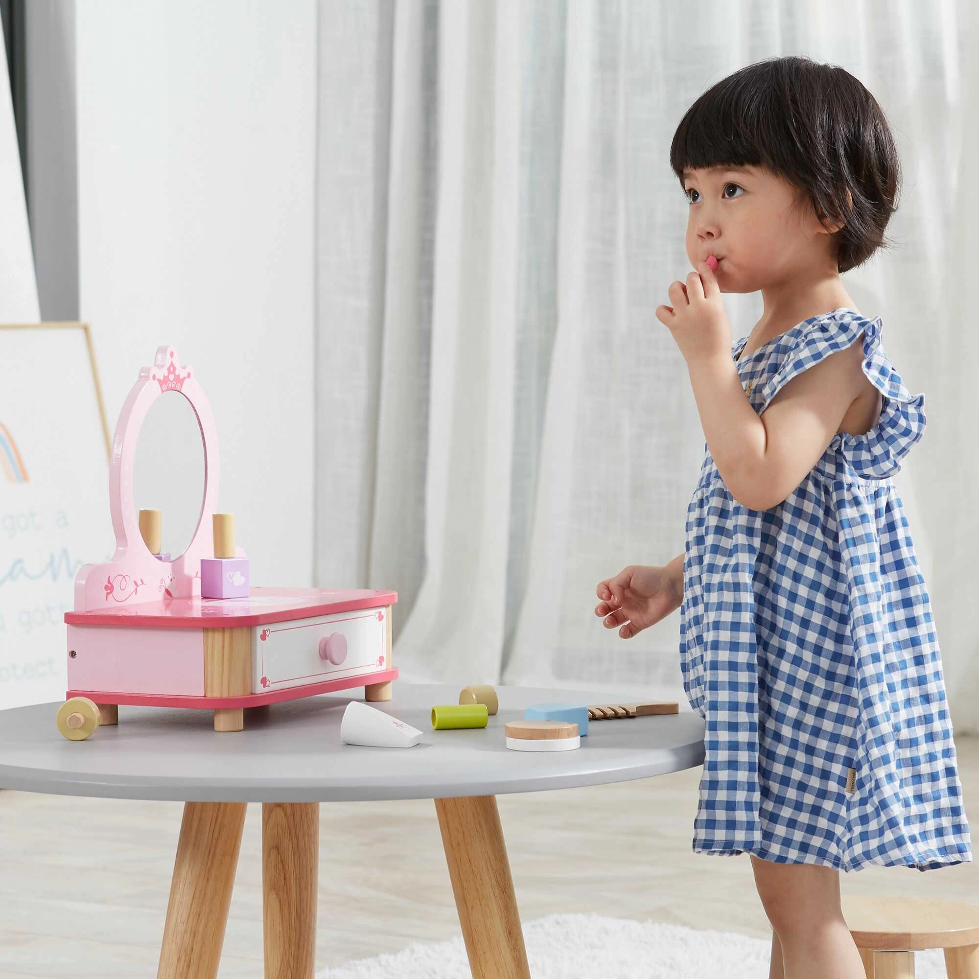Rozā tualetes galdiņš ar elegant u dizainu, no kvalitatīvas koksnes un ar netoksiskām krāsām, kas nodrošina bērnu drošību.