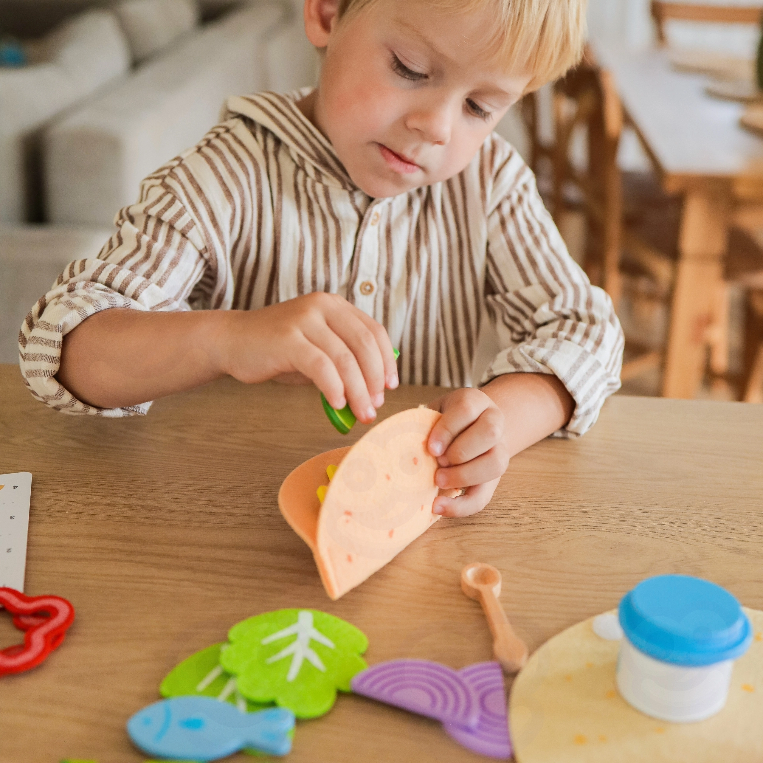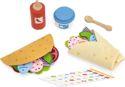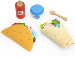 Tortiljas, mērce, “jogurts” un vairāk nekā divdesmit krāsainu koka sastāvdaļu (piem., avokado, sīpols, siers vai zivs) ļauj bērniem katru reizi izveidot atšķirīgu taco un burrito.
