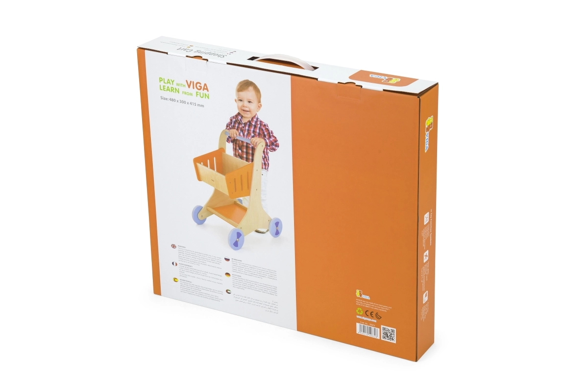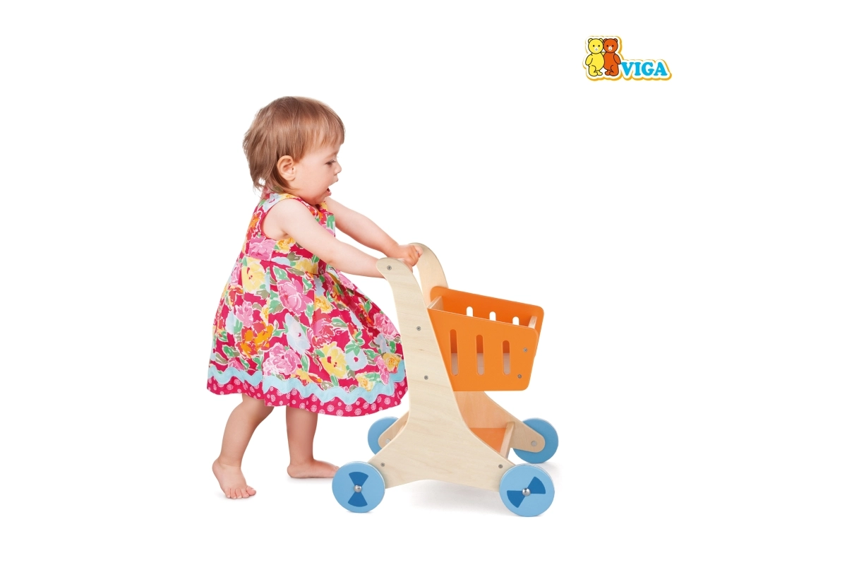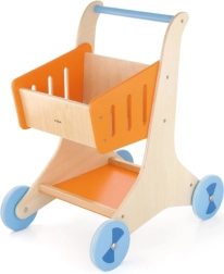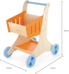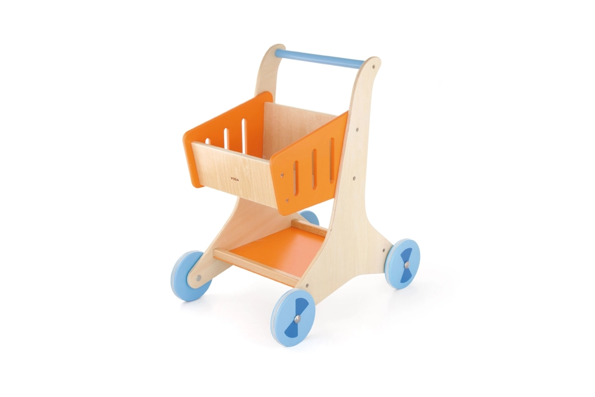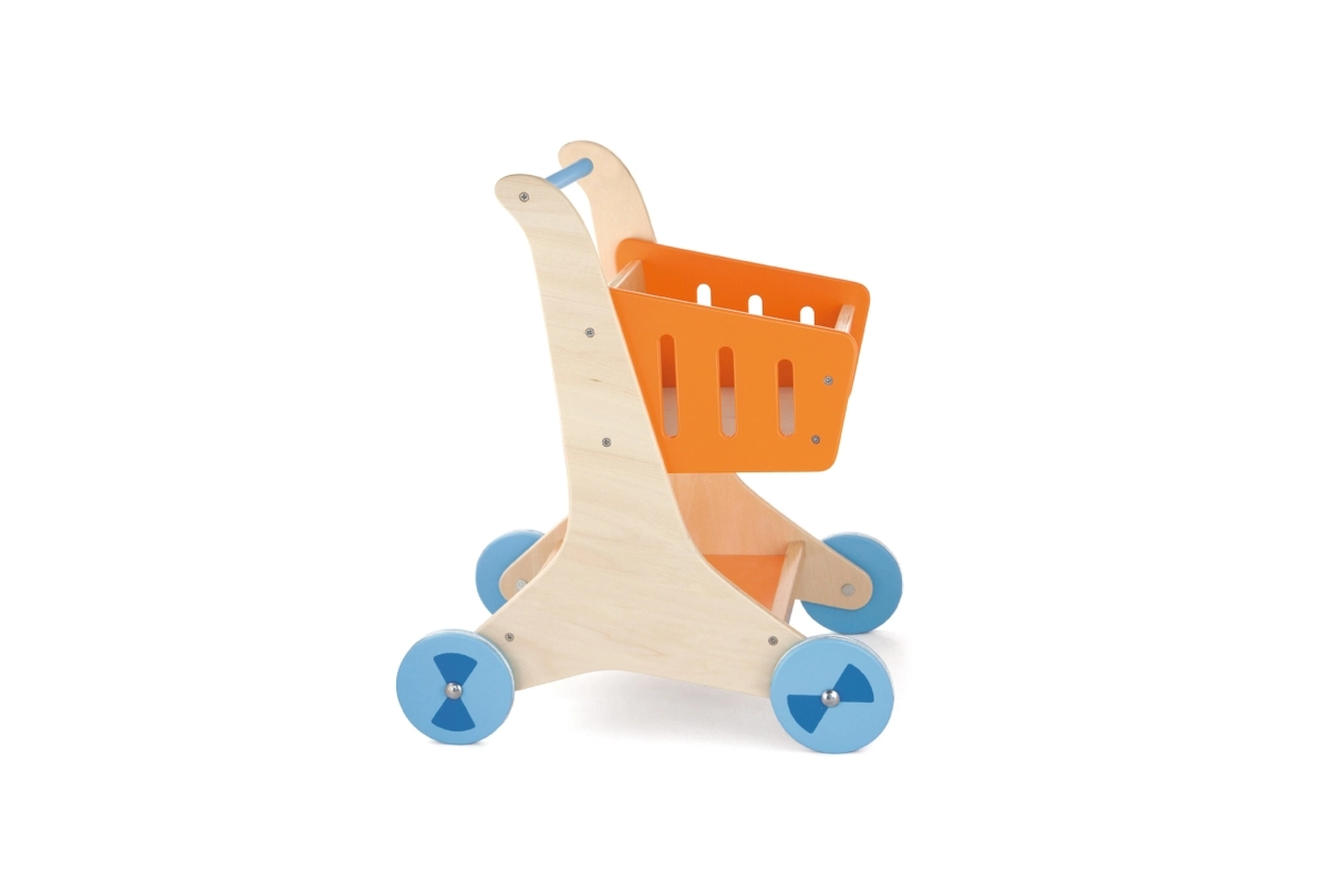 Stilīgi koka iepirkumu ratiņi ar oranžu grozu un zilām ritenīšiem ir ideāli pirmajiem soļiem lomu spēļu pasaulē. Tie veicina lielās motorikas attīstību, līdzsvaru un radošu iztēli. Vieglā, stabilā konstrukcija ar gludām malām ir droša bērniem no 12 mēnešu vecuma.