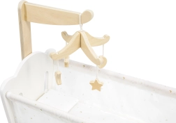 Piekaramais koka karuselis sniedz vizuālus iespaidus un piešķir šūpulītim maģisku noskaņu mierinošiem rituāliem pirms lelles gulētiešanas.