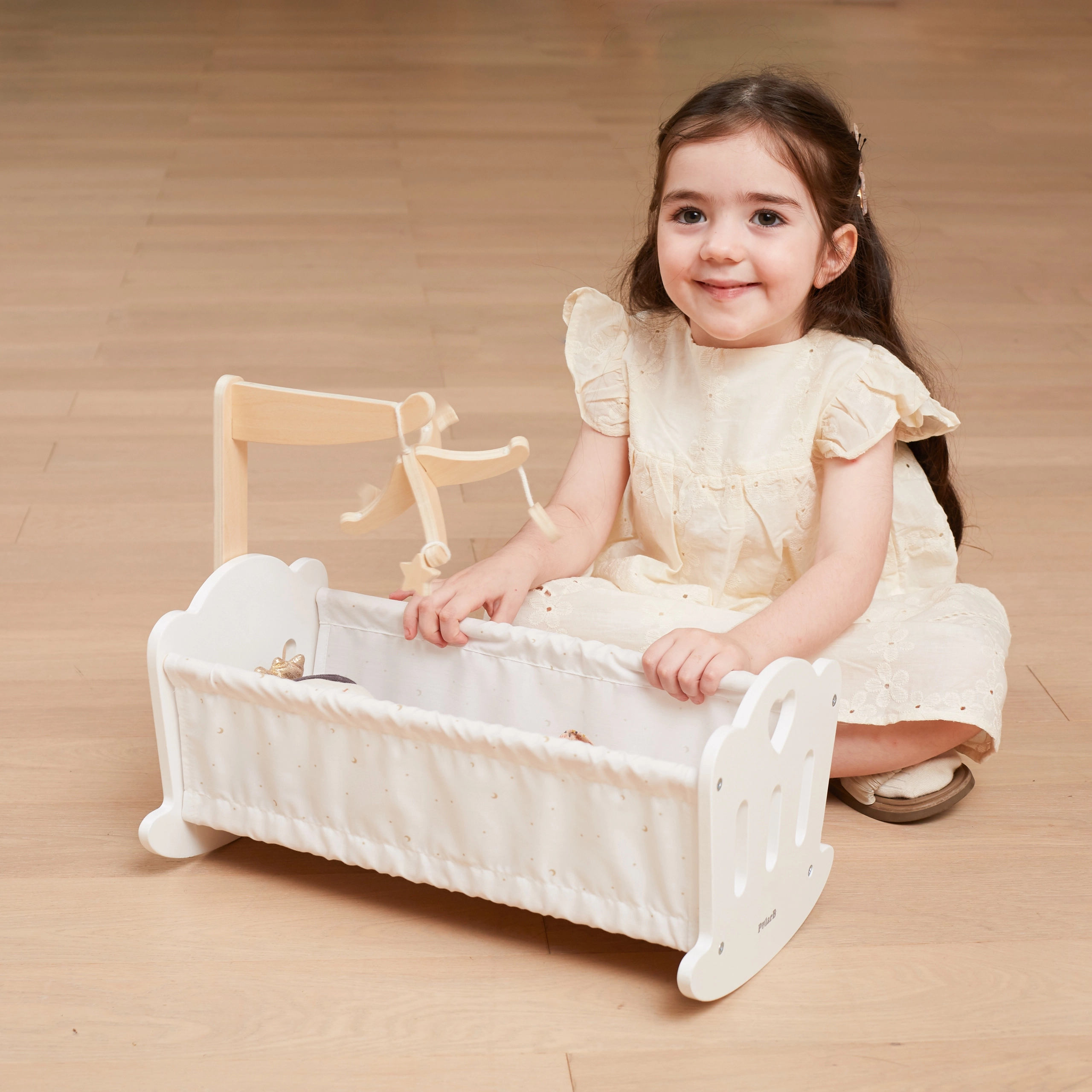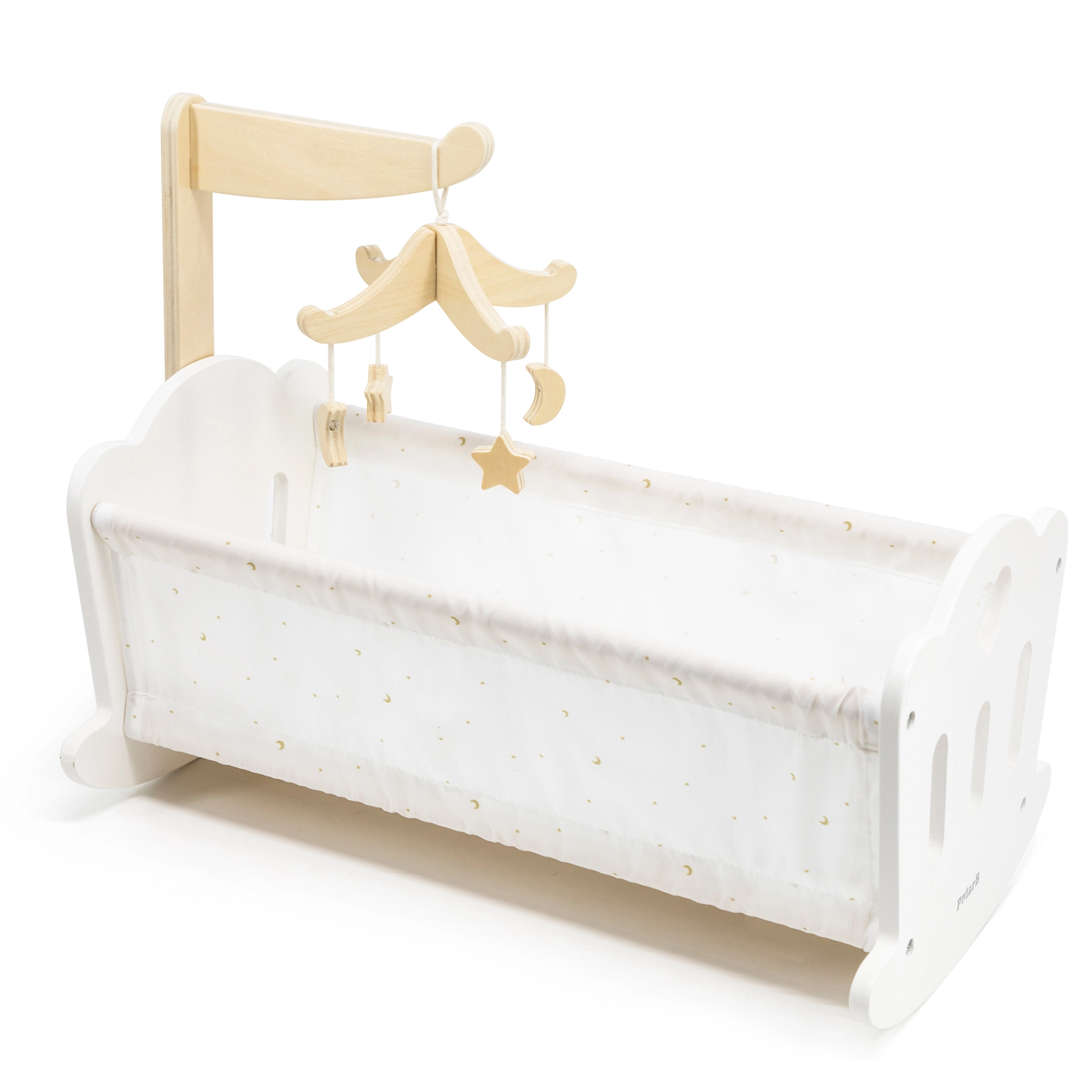 Koka lellīšu šūpulītis PolarB apvieno laikmetīgu dizainu, kvalitatīvu izpildījumu un smalkus tekstilizstrādājumus ar zvaigznīšu un mēnestiņu apdruku. Integrētais koka karuselis ar piekariem piešķir spēlei burvību un palīdz bērniem attīstīt rūpēšanos un mierinošus rituālus.