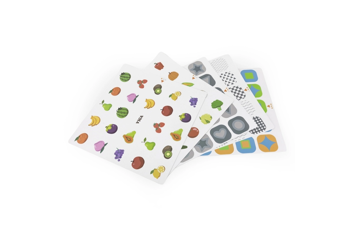 Krāsainas kartītes ar formu, augļu un dzīvnieku motīviem ļauj pielāgot grūtības pakāpi un mācīt bērniem atpazīšanu un šķirošanu.