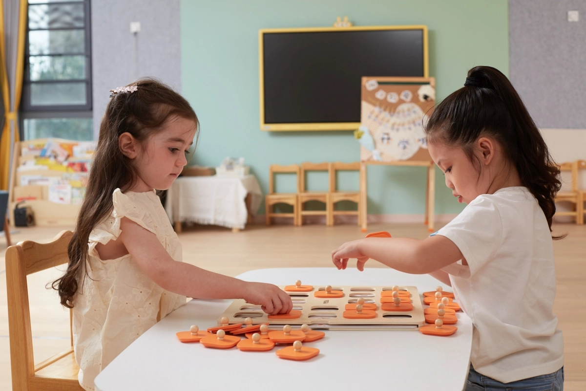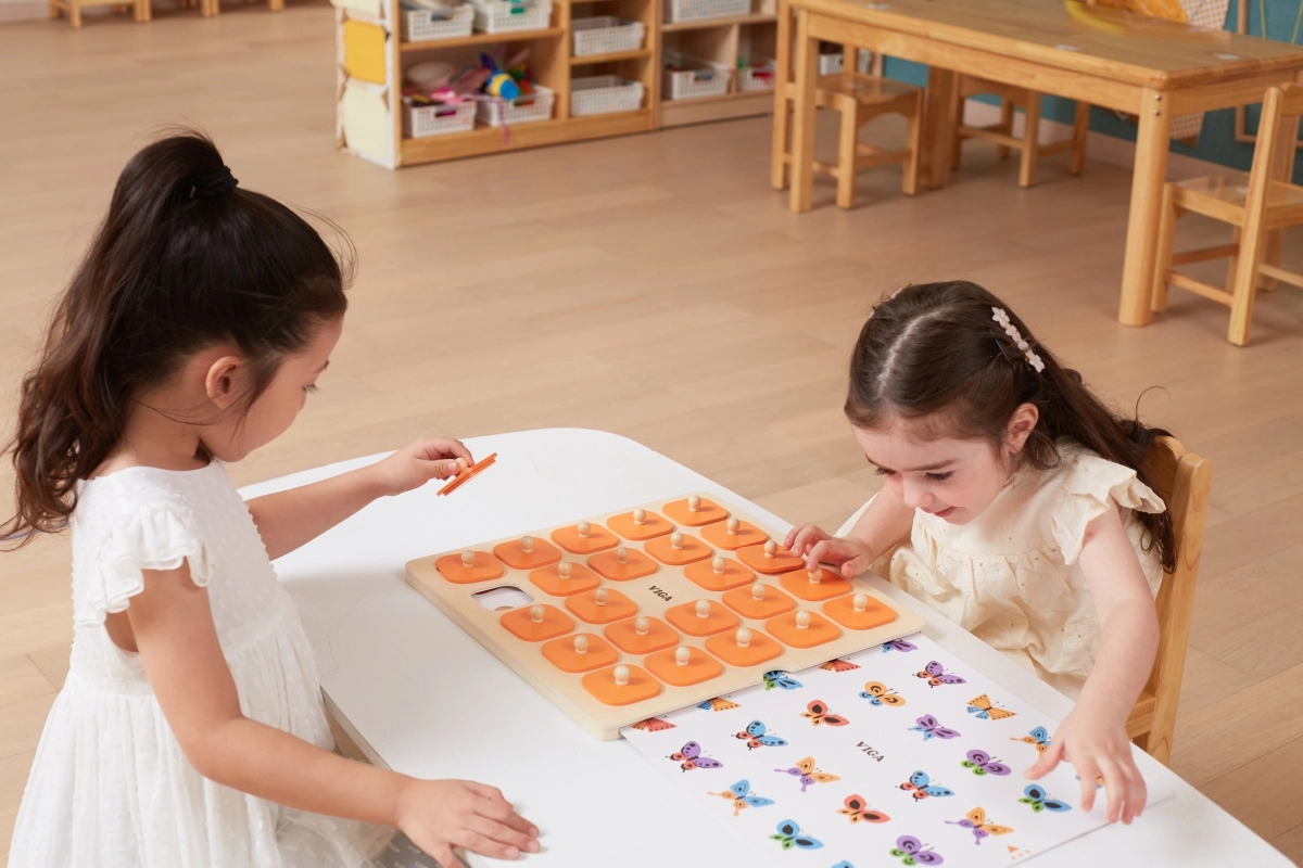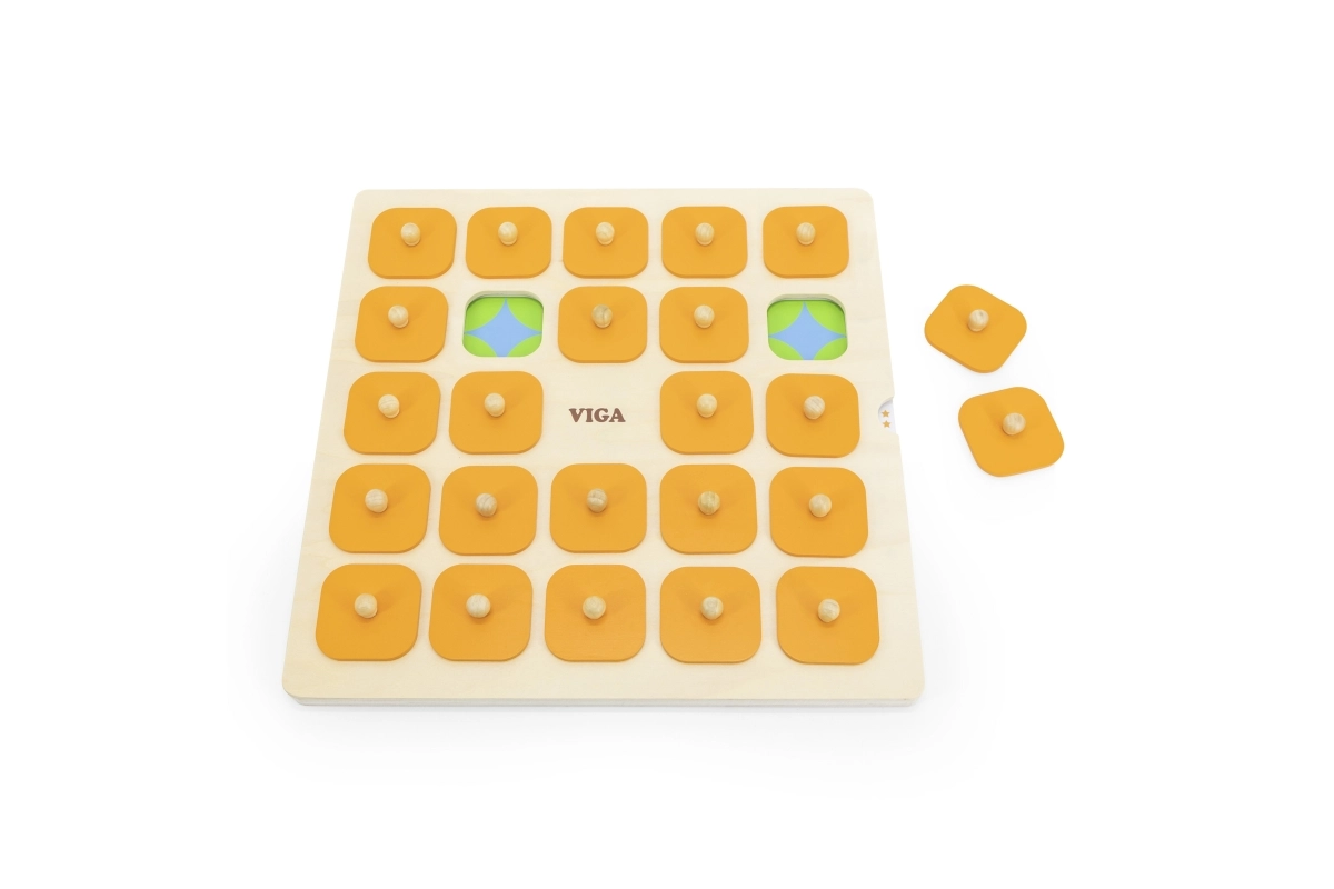 Masīvs koka dēlis ar 25 kvadrātveida lodziņiem un oranžiem pārsegiem ar rokturiem ir izturīgs un ērts mazām bērnu rokām.