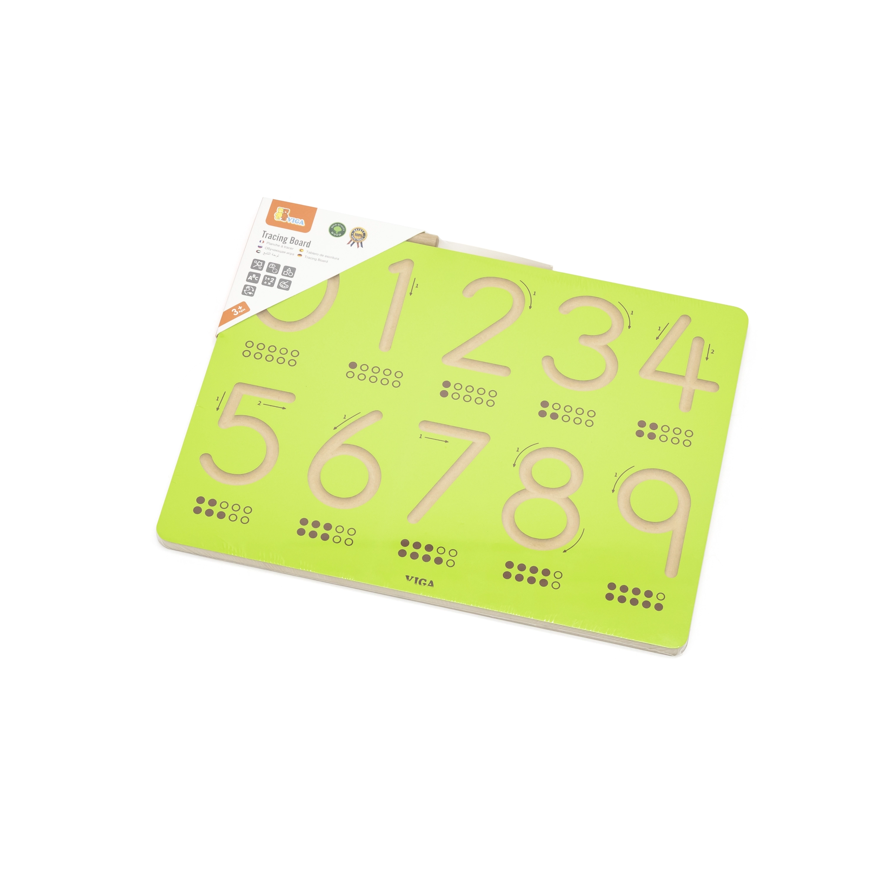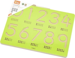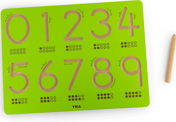 Šī kvalitatīvā koka tabula ar izfrēzētiem cipariem 0–9 ir ideāls palīglīdzeklis pirmajiem soļiem rakstīšanā. Bērns ar koka pildspalvu seko liektām rievām ar virziena bultiņām, tā nostiprinot pareizu ciparu formu, ritmu un atmiņas nospiedumus vienmērīgākai pārejai uz rakstīšanu ar zīmuli.