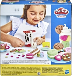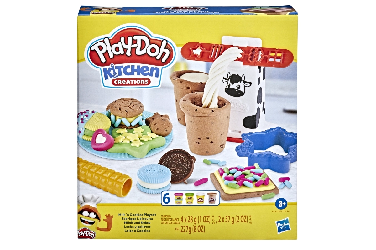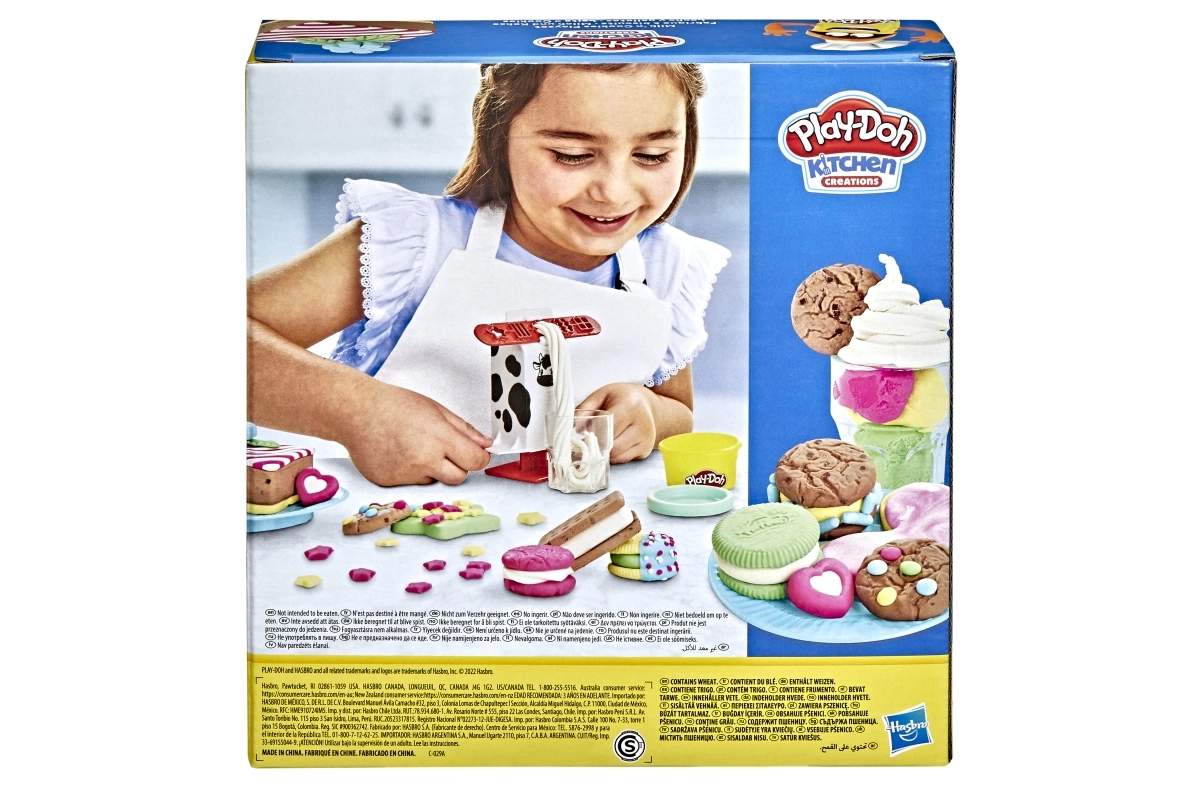 Ar Play-Doh Virtuves radīšana – Piena bārs bērni, izmantojot daudzveidīgos rīkus un krāsaino plastilīnu, var veidot realistiski izskatīgu pienu un cepumus. Komplektā iekļauts: