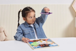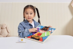 Manipulatīvā tāfele ar burvi ir ideāls palīgs pirmajiem soļiem patstāvīgā ģērbšanās procesā. Bērni droši izmēģina dažādu aizdares veidu atvēršanu un aizvēršanu – no rāvējslēdzēja un pogām līdz spiedpogām, sprādzēm un šņoru vēršanai. Pateicoties koka pamatnei un tekstila elementiem, rotaļa ir patīkama taustei un rosina atkārtotu treniņu.