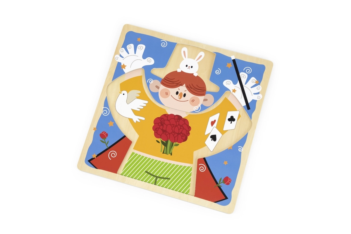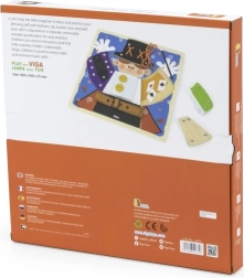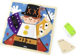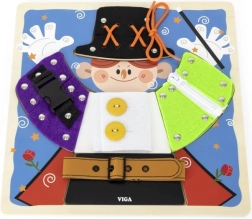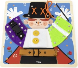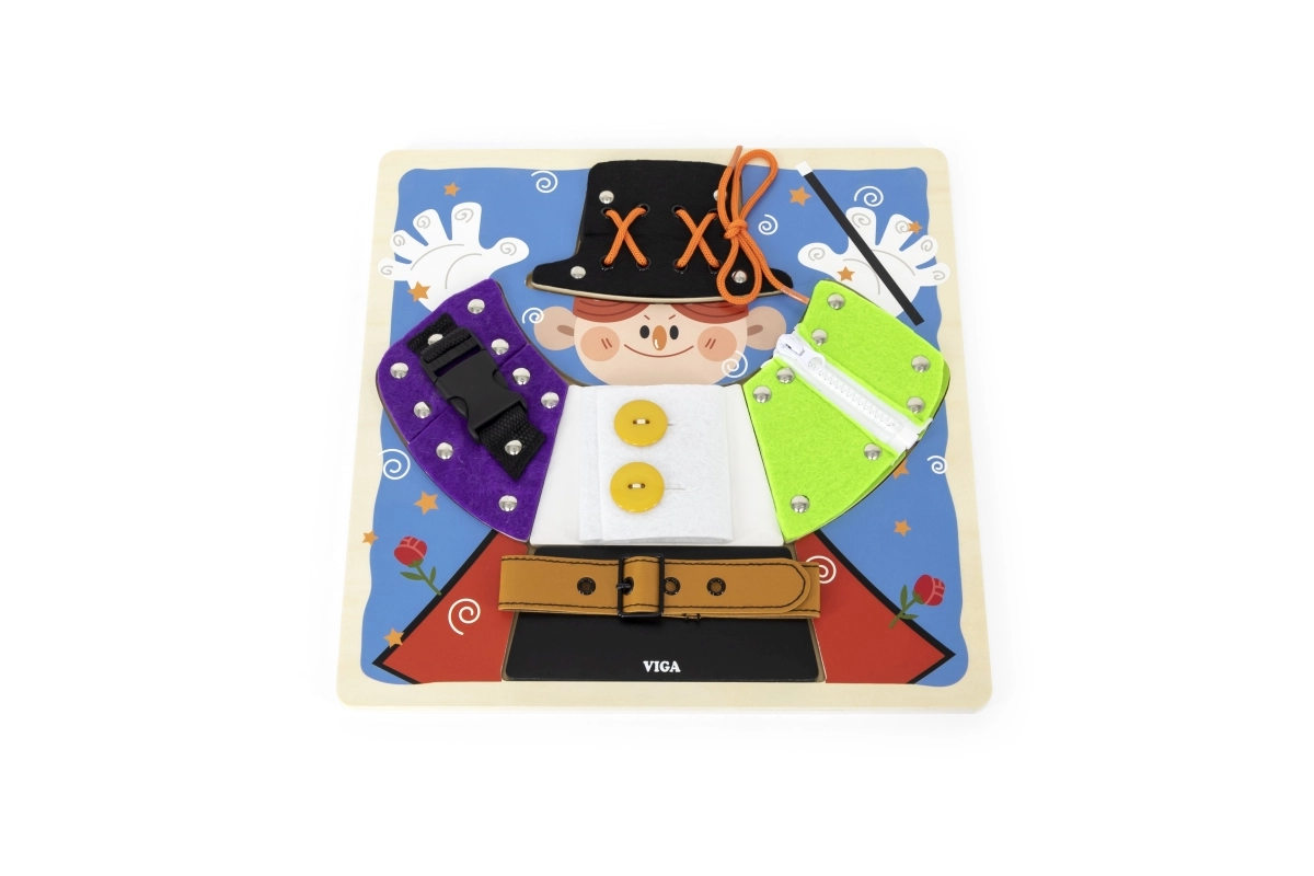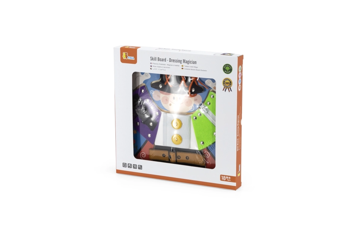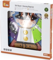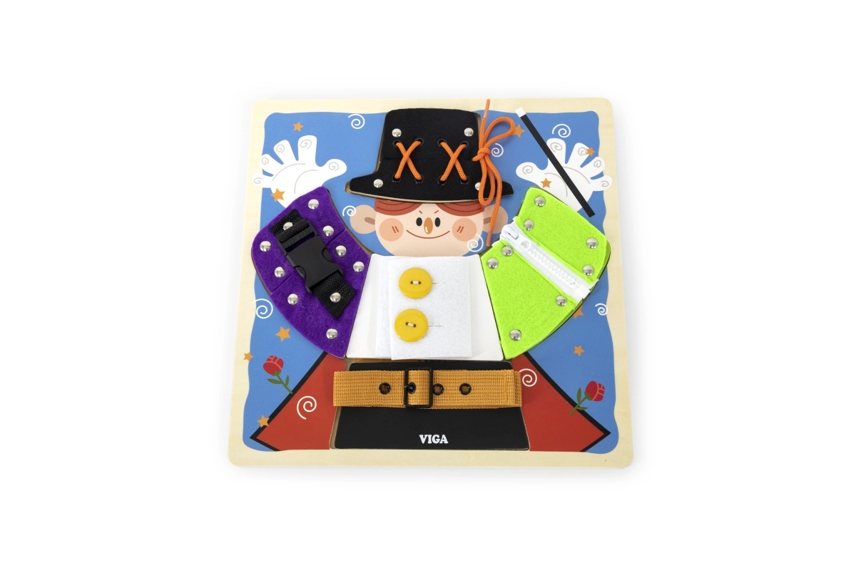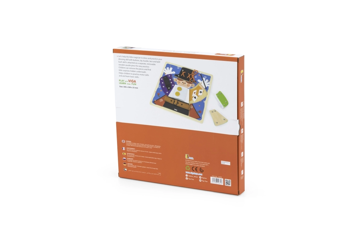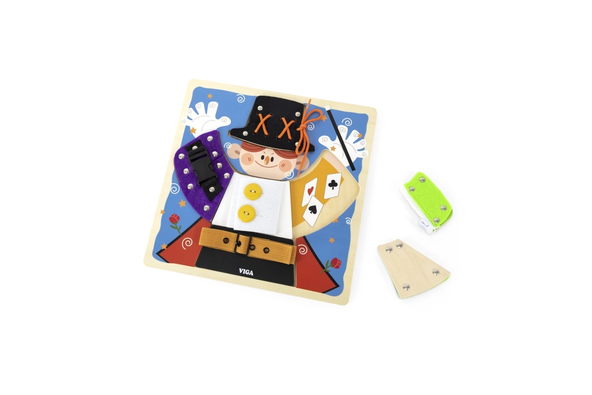 Izklaidējoša koka tāfele no VIGA ar maza burvja motīvu māca bērniem no 18 mēnešu vecuma ģērbšanās un pašapkalpošanās pamatus. Spēlējoties viņi trenē rāvējslēdzējus, pogas, spiedpogas, sprādzes un šņorēšanu, attīsta sīko motoriku, roku–acs koordināciju un patstāvību. Zem apģērba detaļām paslēpti burvju elementi kalpo kā rotaļīga atmiņas aktivitāte.