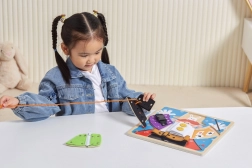 Rāvējslēdzēji, pogas, spiedpogas, sprādzes un šņorēšana – bērns izmēģina dažādus aizdarīšanas veidus un dabiskā veidā nostiprina pašapkalpošanās prasmes.