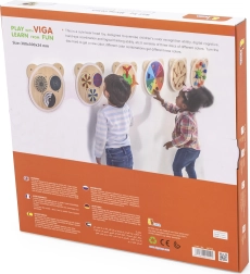 Uzmanība drošībai un kvalitātei: izstrādājums veidots no izturīga, lakota koka un krāsots ar netoksiskām, košām krāsām. Rotaļas dabiski attīsta sīko motoriku, koordinācijas prasmes, loģisko domāšanu un veicina krāsu atpazīšanu. Pieejama vesela sērija sienas lācīša tāfeļu ar dažādām funkcijām – lieliski piemērotas modulāram sensoru stūrītim.