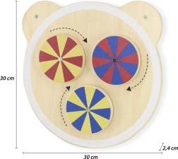 Koka tāfele ar mīlīgu lācīša galviņu pārvērtīs jebkuru bērnu stūrīti radošā rotaļu telpā. Trīs krāsainie ritenīši viegli griežas, ļaujot vērot iespaidīgus optiskos efektus, kas piesaista bērnu uzmanību un mudina uz turpmāku izziņu. Tāfele ir ideāli piemērota bērnu istabai, kā arī bērnudārziem un rotaļu zonām.
