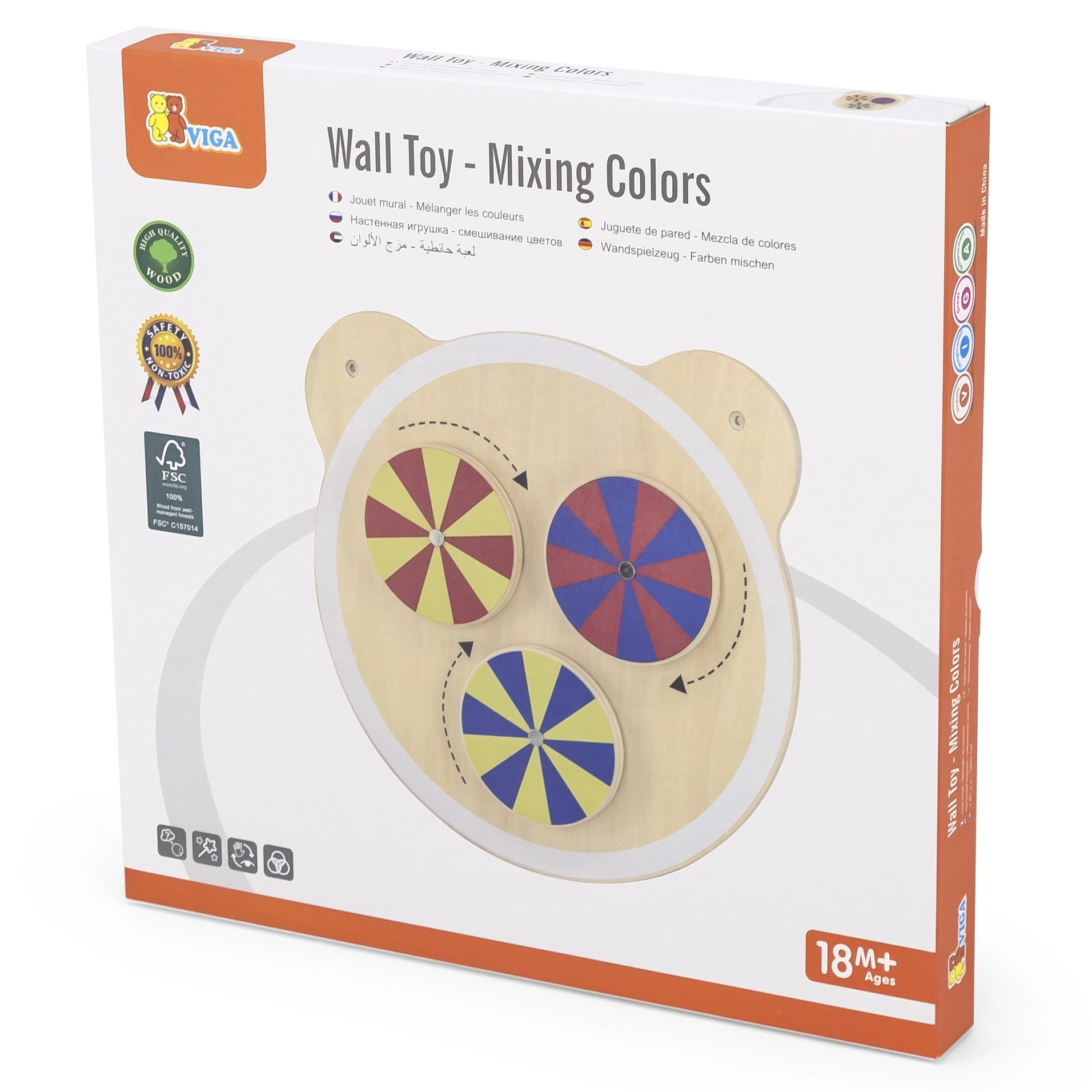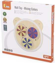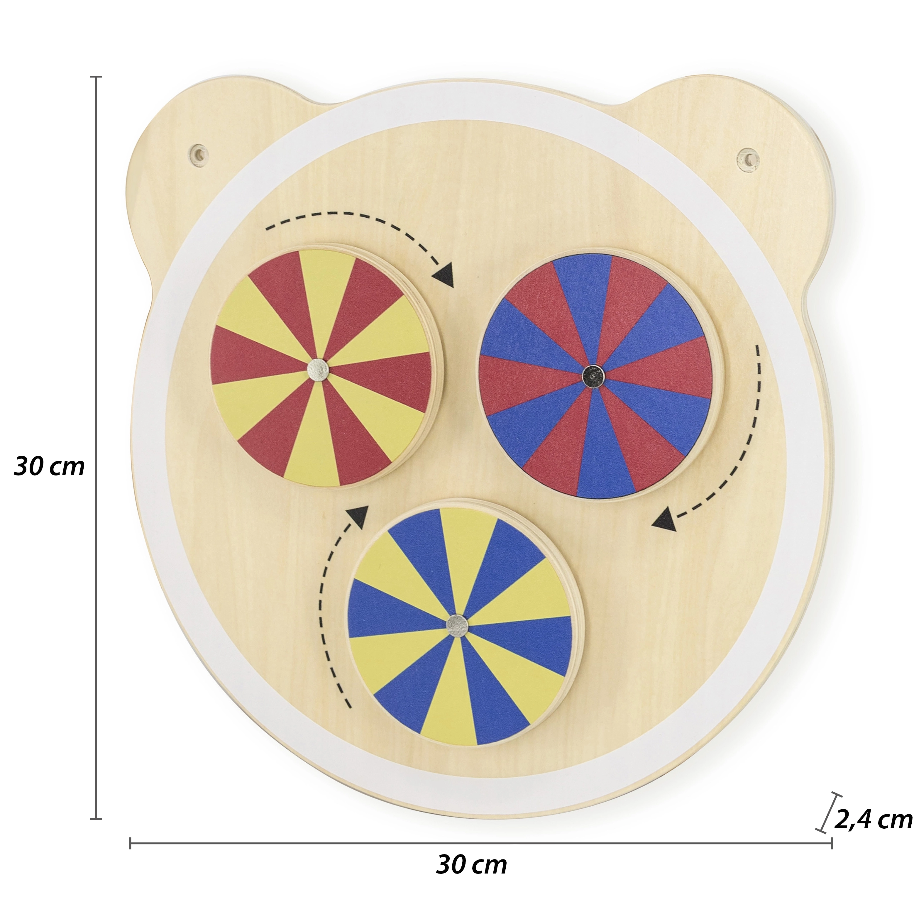 Trīs viegli griežami ritenīši pamatkrāsās, griežoties, veido saistošus rakstus. Bērni rotaļīgā veidā mācās atpazīt krāsas un uztvert kustību un ritmu.