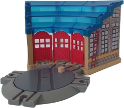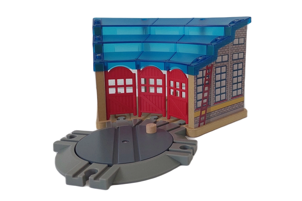 Šis kvalitatīvais depo ar apgriežamo platformu paplašinās jebkuru koka dzelzceļu un pārvērtīs to par rosīgu dzelzceļa mezglu. Trīs stāvvietas ar krāsainām durvīm un funkcionāla apgriežamā platforma ļauj vienmērīgi novietot un virzīt lokomotīves. Atveramais, divu līmeņu jumts nodrošina ātru piekļuvi interjeram spēlēšanai, tīrīšanai un nelieliem “remontiem”.