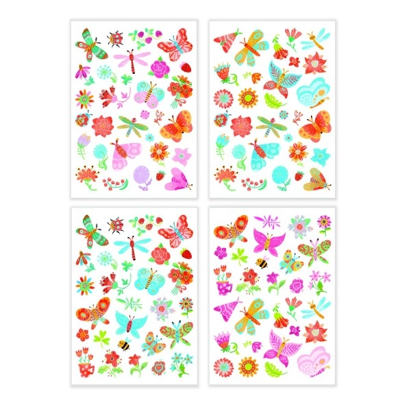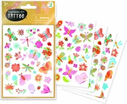 Rotā savu ādu ar maigiem dabas motīviem. Šajā pagaidu tetovējumu komplektā ir krāsaini tauriņi un ziedi, vienkārša uzklāšana 30 sekundēs un droša noņemšana ar ziepēm vai eļļu. Iepakojumā ietilpst 4 loksnes ar pavasara motīviem, piemērotas bērniem no 3 gadu vecuma.
