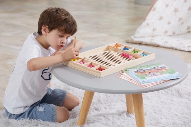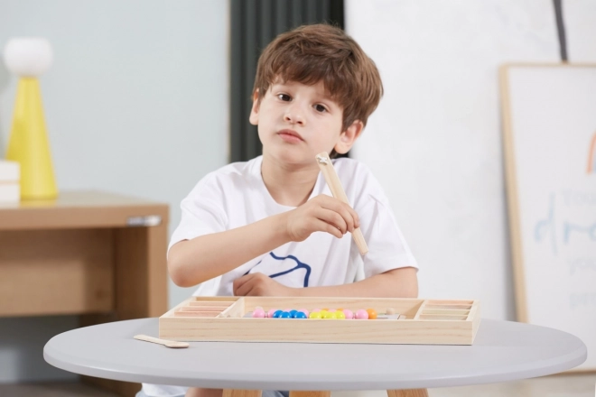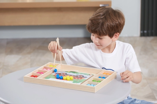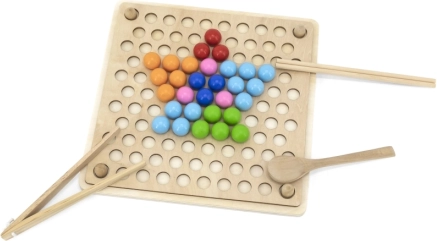 Koka izglītojošā spēle “Noķer un Sakārto” ļauj bērniem izmēģināt dažādus rakstus un krāsas pēc pievienotajām kartītēm vai pēc savas fantāzijas. Ar šo spēli bērni var piestiprināt papīru pie koka paliktņa un, izmantojot kociņus, karoti vai klipsi, ievietot krāsainas bumbiņas plāksnes atverēs. Noslēgumā bērni var izveidot skaistus attēlus.