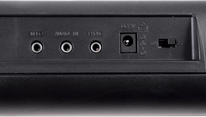 - MIC (mikrofona ieeja), AUDIO IN (line in), PHONE/LINE OUT (austiņas / izeja uz ārējiem skaļruņiem)