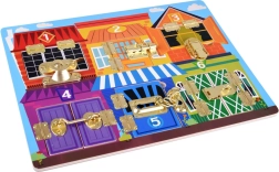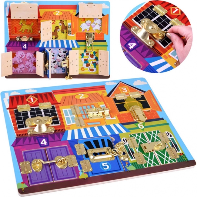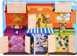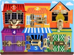Šī interaktīvā manipulatīvā tāfele apvieno bērniem daudz jautrības un mācīšanos vienlaikus. Katrs krāsains namiņš ir apzīmēts ar ciparu un aiz durtiņām slēpj dzīvnieciņus skaitā, kas atbilst attiecīgajam ciparam. Bērni trenē skaitīšanu, krāsu atpazīšanu un loģisko domāšanu, kamēr dažādu slēdzeņu atvēršana stiprina sīko motoriku un roku–acs koordināciju.