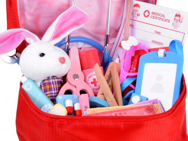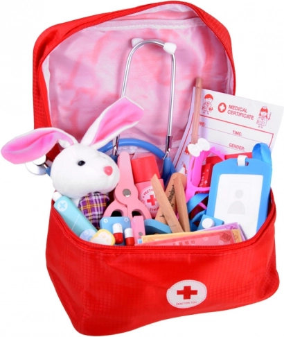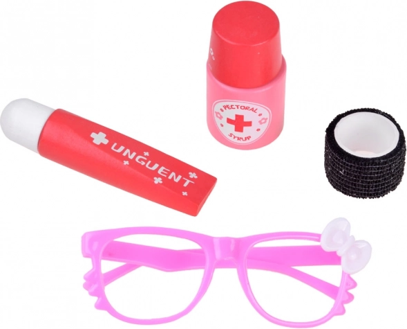 Komplektā ir arī termometrs ar maināmiem diskiem, šļirce, šķēres, pincete, pārsējs, plāksteri, “zāles” tabletēs un kapsulās (rekvizīti), sīrups un ziede tūbiņā, pacienta kartes un ārsta apliecība. Viss ērti glabājas izturīgā sarkanā aptieciņā ar rokturi, tādēļ komplekts ir ideāls ceļojumiem un ātriem “izsaukumiem”.