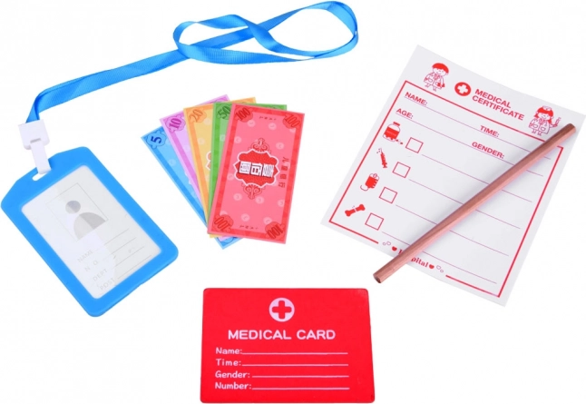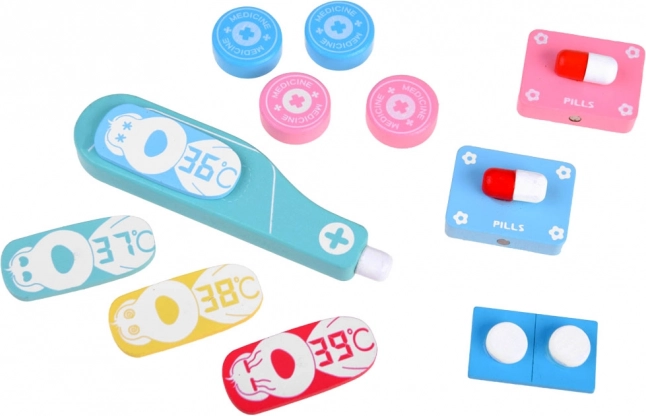 Šļirce, šķēres, pincete un termometrs ir izgatavoti no izturīga koka ar patīkamu virsmu. Tie veicina sīko motoriku un drošu spēli.