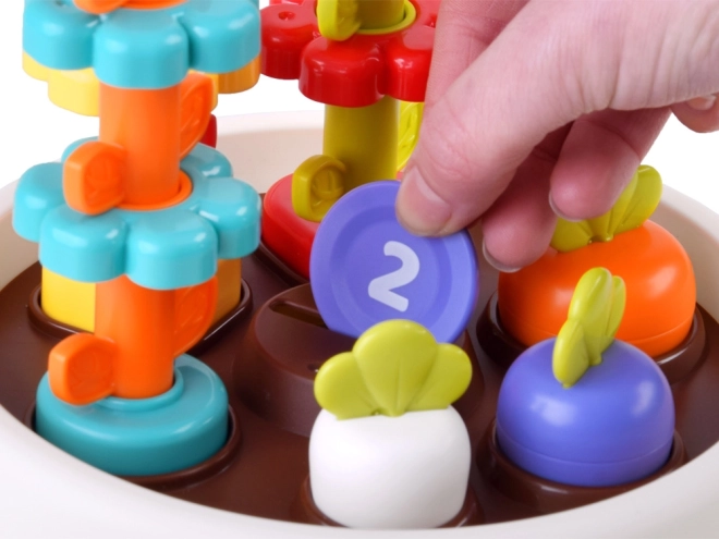 Rotaļlieta attīsta bērna smalkās motorikas prasmes ar interaktīviem elementiem, piemēram, sakraujamām puķēm un krāsainiem žetoniem.