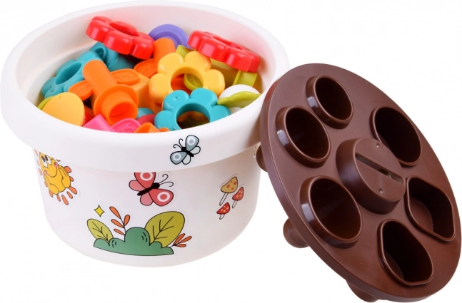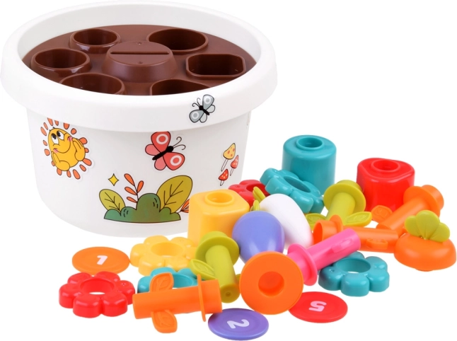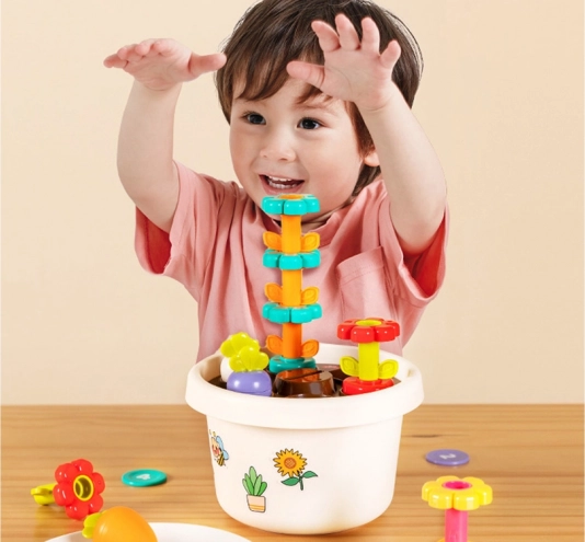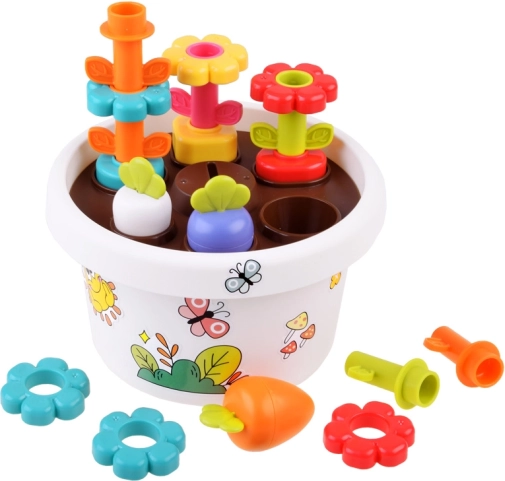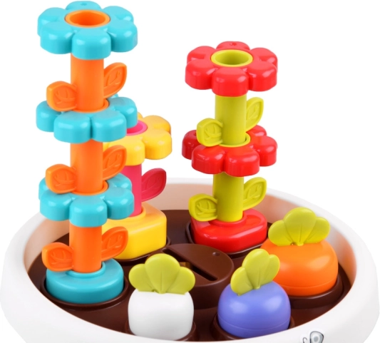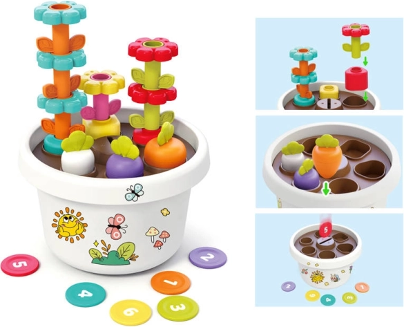 Katra rotaļlietas daļa piedāvā dažādas iespējas mācīties pamatkrāsas un formas. Visas detaļas var ērti salikt puķu podā, kas taupa vietu un palīdz uzturēt kārtību.