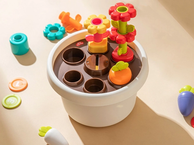 Puķu poda pamatnes centrā atrodas atvere žetonu ievietošanai, kas pilnveido roku un acu koordināciju. Komplektā ir arī krāsainas uzlīmes puķu poda dekorēšanai, tā attīstot bērnu radošumu.