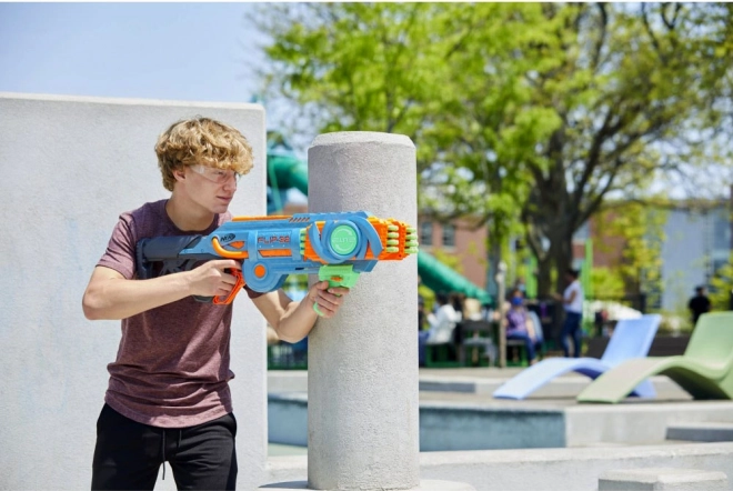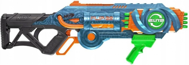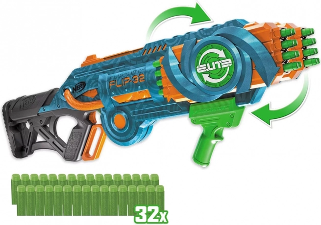 Nerf Elite 2.0 Flip-32 blasteris ir izgatavots no kvalitatīvas plastmasas, bet lodes – no drošām putām ar gumijas galiem. Rotējošo magazīnu sistēma nodrošina elastību un nepārtrauktu spēli arī pēc pirmās lodžu kārtas izšaušanas. Pietiek pagriezt magazīnu par 180 grādiem, un izklaide var turpināties. Divi šaušanas režīmi piedāvā vai nu atsevišķus šāvienus, vai dubulto šāvienu.