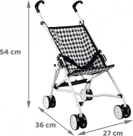 Atklājiet lielisku rotaļu biedru – saliekamos leļļu ratiņus ar melnbaltu pepito rakstu. Izturīgs metāla rāmis, ērti rokturi un drošības josta gādā, lai lelle būtu drošībā un bērns braucienu izbaudītu bez piepūles. Pateicoties kompaktajiem izmēriem, ratiņus ir viegli pārnēsāt un glabāt.