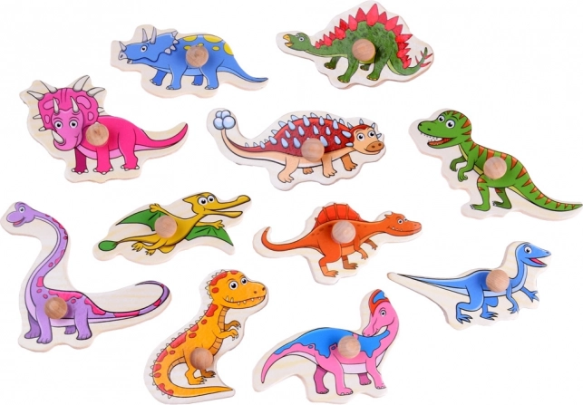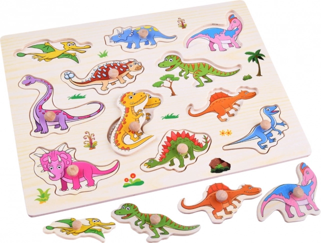 Ieliktnis ir ideāli piemērots pirmajai iepazīšanai ar puzlēm – stingra koka pamatne notur visus gabaliņus kopā, bet skaidri iezīmētās formas palīdz veiksmīgi salikt. Uz dēļa kopumā atrodami 11 dinozauri, tostarp iecienītas sugas kā T–Rex, triceratops un stegozaurs.