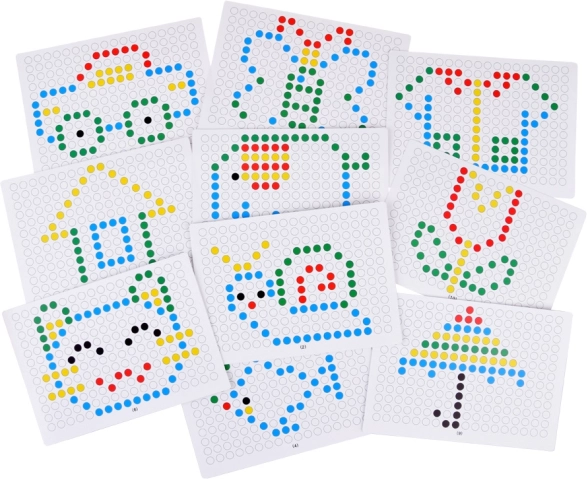 Komplektā ir kartītes ar motīviem (auto, māja, zivs, zieds u.c.), kurus bērni pārnes uz režģa, izmantojot krāsainus tapoņus. Formu un rakstu apguve ir jautra un intuitīva.