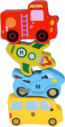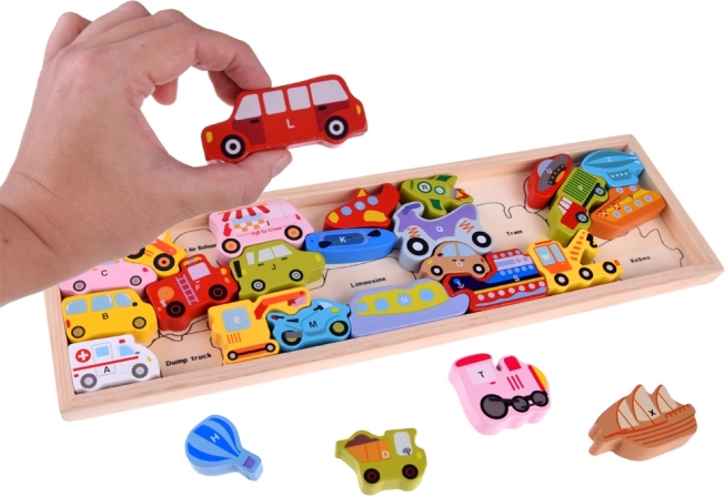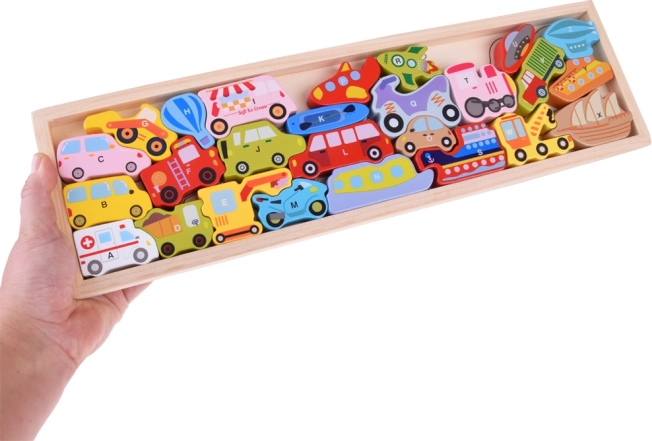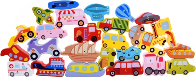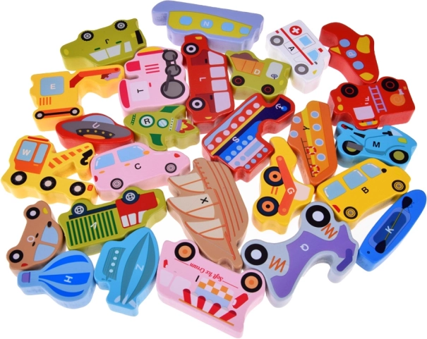Šis koka komplekts ietver 27 krāsainus transportlīdzekļus – no automašīnas, autobusa un ugunsdzēsēju auto līdz balonam, kuģim, raķetei un gaisa kuģim – kā arī koka pamatni ar atzīmētiem nosaukumiem. Katrs gabals nes burtu A–Z (ieskaitot īpašu motīvu), kas palīdz bērniem jautrā veidā apgūt alfabētu un paplašināt vārdu krājumu.