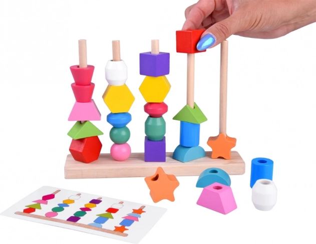 Šī daudzfunkcionālā koka rotaļlieta piedāvā divus spēles veidus: krāsainu kreļļu vēršanu uz aukliņām un formu kārtošanu uz statīva ar piecām tapām pēc paraugiem. Pateicoties košajām krāsām un daudzveidīgajām ģeometriskajām formām, tā dabiski veicina redzes, taustes un telpiskās uztveres attīstību.