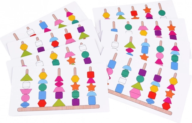 Spilgtas krāsas un dažādas formas veicina atpazīšanu un šķirošanu. Kartītes ar paraugiem attīsta loģiku, secības uztveri un pacietību.