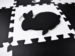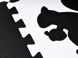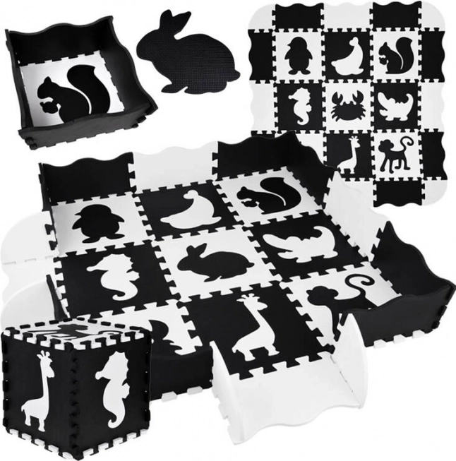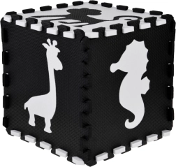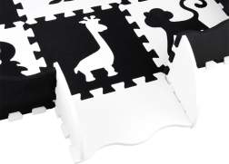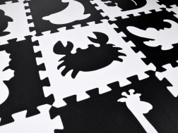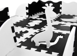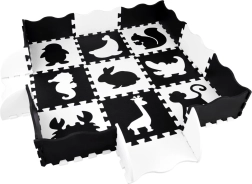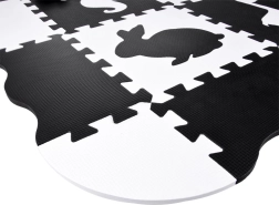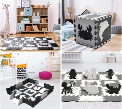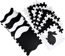Stilīgs melnbalts putu paklājiņš no 16 daļām rada drošu un ērtu rotaļu vietu gan zīdaiņiem, gan lielākiem bērniem. Kontrastainās krāsas stimulē redzi, mīkstā EVA putas slāpē triecienus, bet abpusēja virsma ar pretslīdes tekstūru palielina drošību. Daļas var brīvi kombinēt, malas var salikt vertikāli un izveidot noslēgtu zonu rotaļlietām vai bumbiņām.