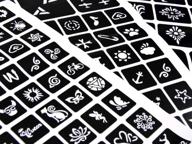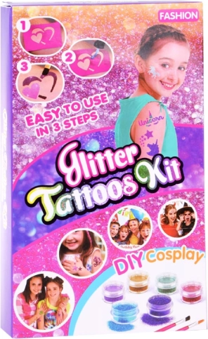 Ar šo mirdzošo tetovējumu komplektu jūs varat uzreiz izveidot satriecošus mirdzošus tetovējumus. Tas ietver 120 šablonas dažādos izmēros, 24 burciņas ar skaistiem mirdzumiem un 2 līmes pudelītes, kas pietiks daudziem tetovējumiem. Iekļautas arī mirdzošas acu ēnas un otu komplekts nevainojamam stilīgam izskatam.