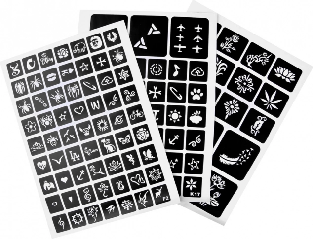 Instrukcija: Izvēlieties šablonu un pielīmējiet to uz tīras ādas, uzklājiet rakstu ar līmi, noņemiet šablonu, pievienojiet mirdzumu krāsas un gatavs!