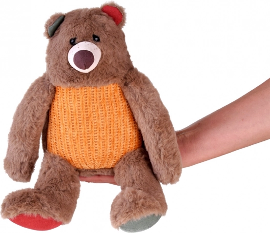 Mīlīgais plīša lācītis Teodors ir ideāls draugs gan mazākiem, gan lielākiem bērniem. Šis mīkstais brūnais lācītis ir perfekts apskaušanai un sniedz komforta un drošības sajūtu. Tā košās krāsas — oranžais adītais džemperis, zaļās un sarkanās austiņas un ķepiņas — piešķir rotaļlietai jautru izskatu.